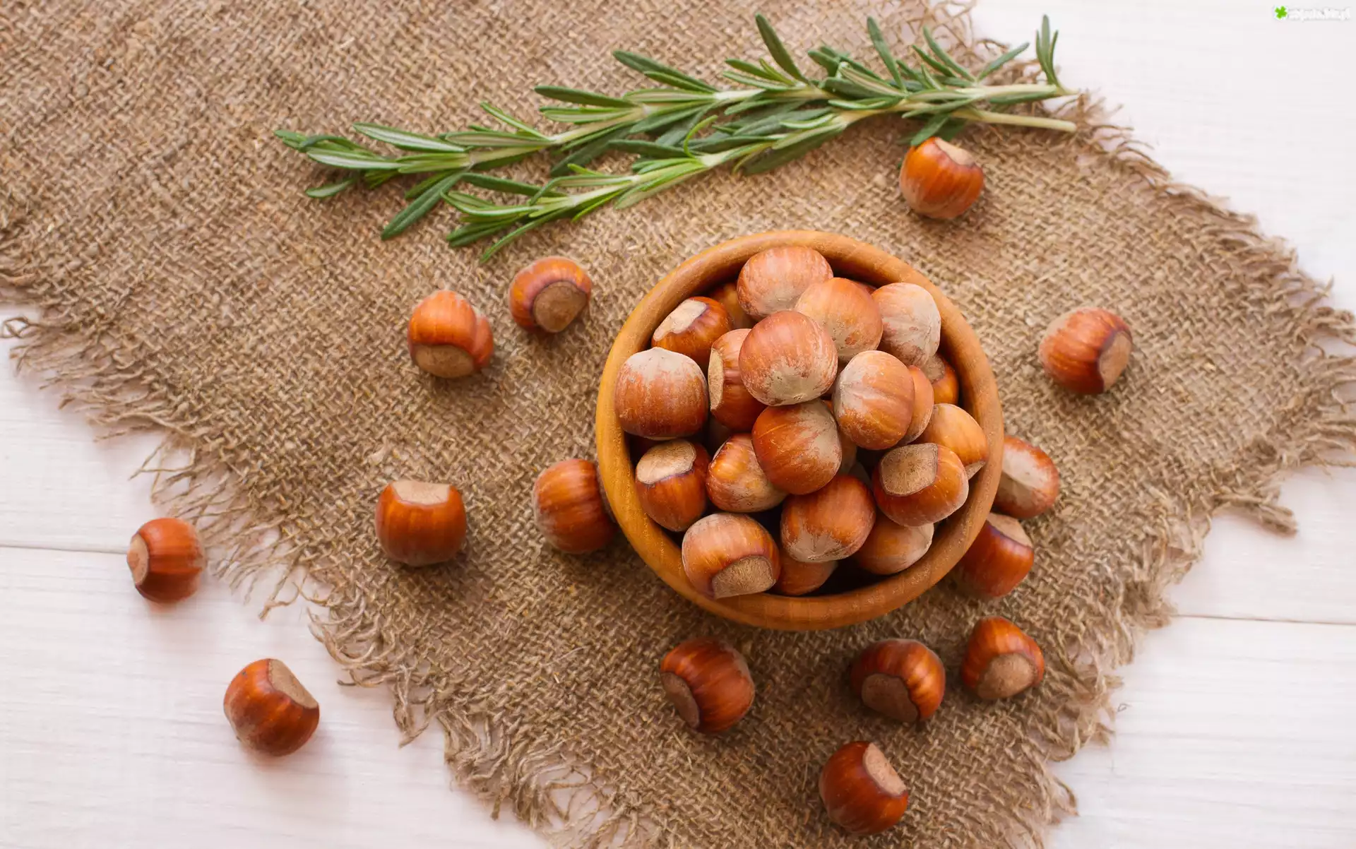 Zdjęcie Orzechy laskowe, Płótno, Rozmaryn, Miseczka, Deski