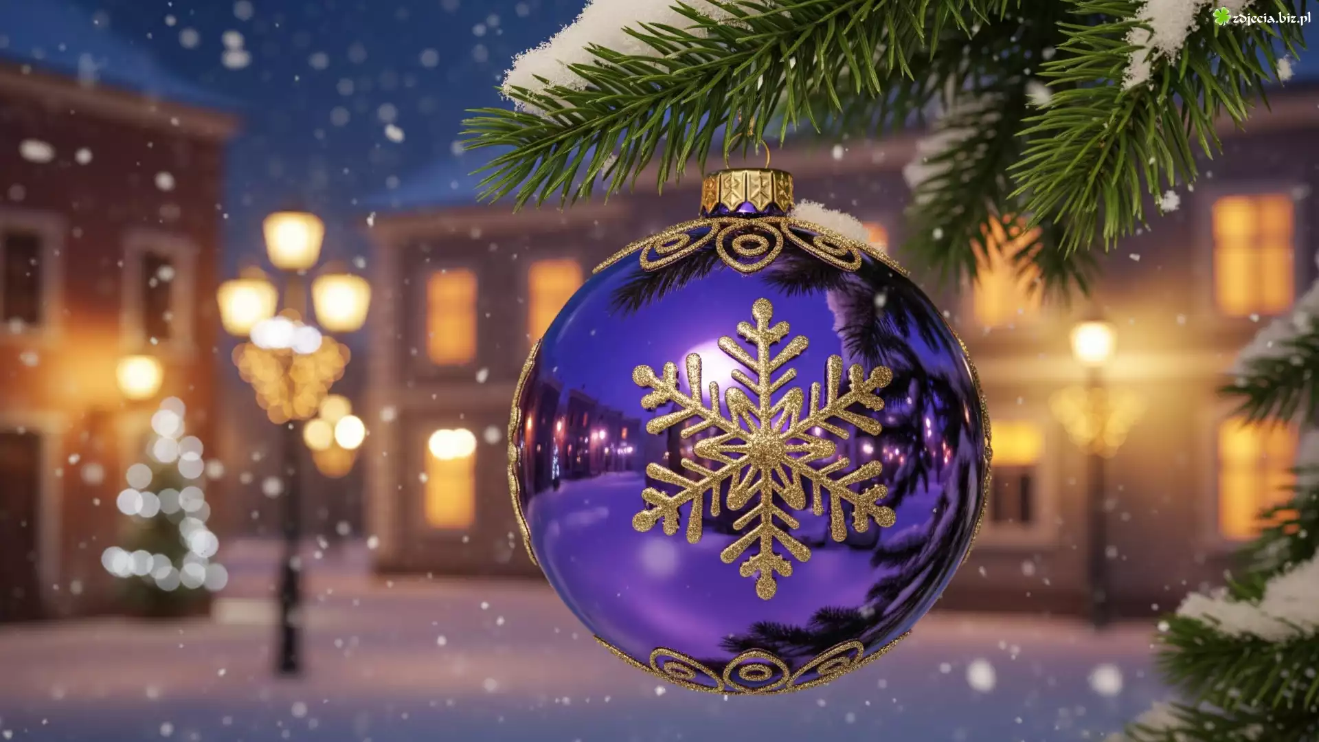 Zdjęcie Fioletowa, Bombka, Gałązka, Ośnieżona, Boże Narodzenie
