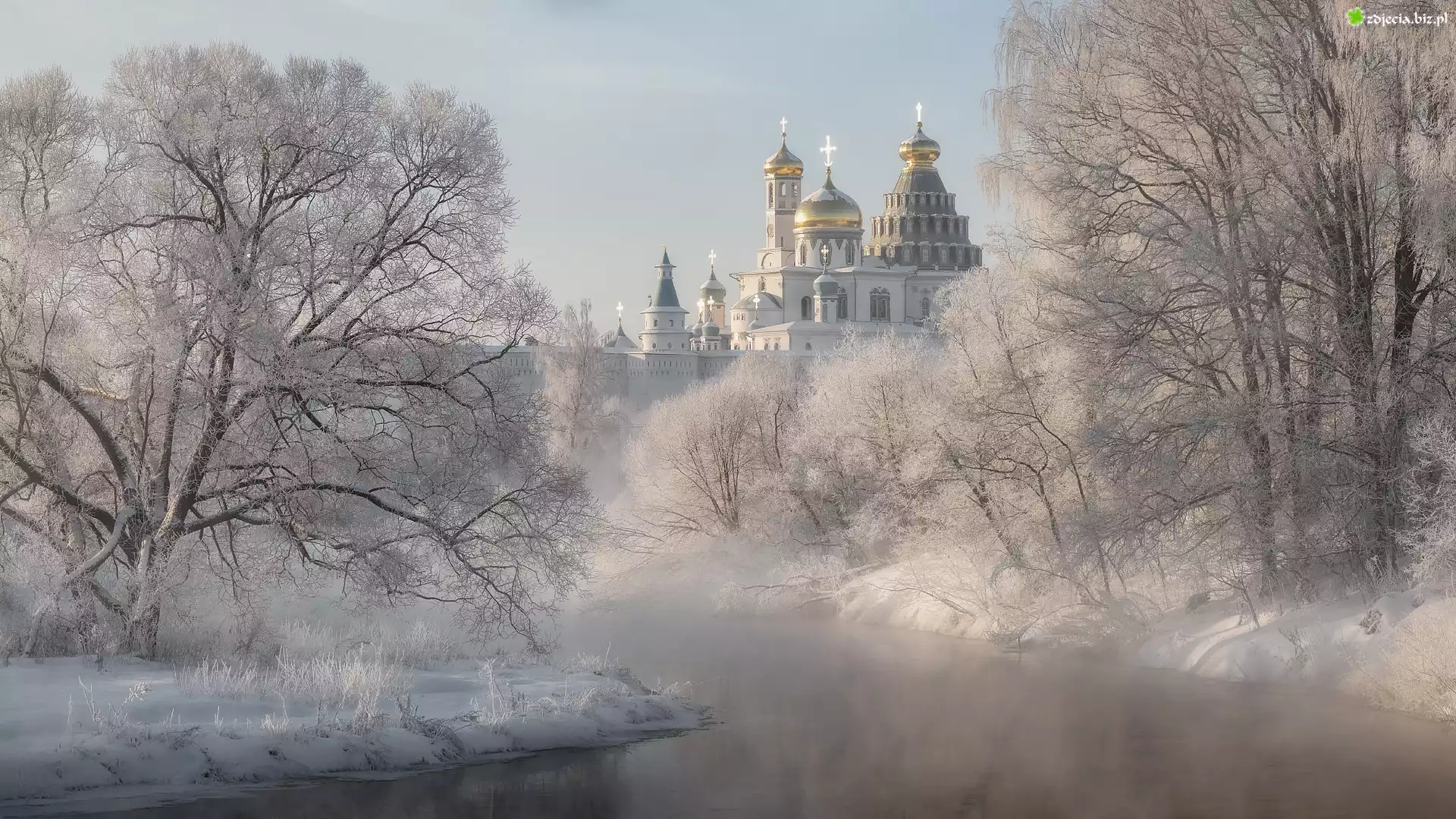 Zdjęcie Zima, Cerkiew, Monaster Zmartwychwstania Pańskiego, Nowe Jeruzalem, Ośnieżone, Drzewa, Rzeka Istra, Istra, Obwód moskiewski, Rosja |