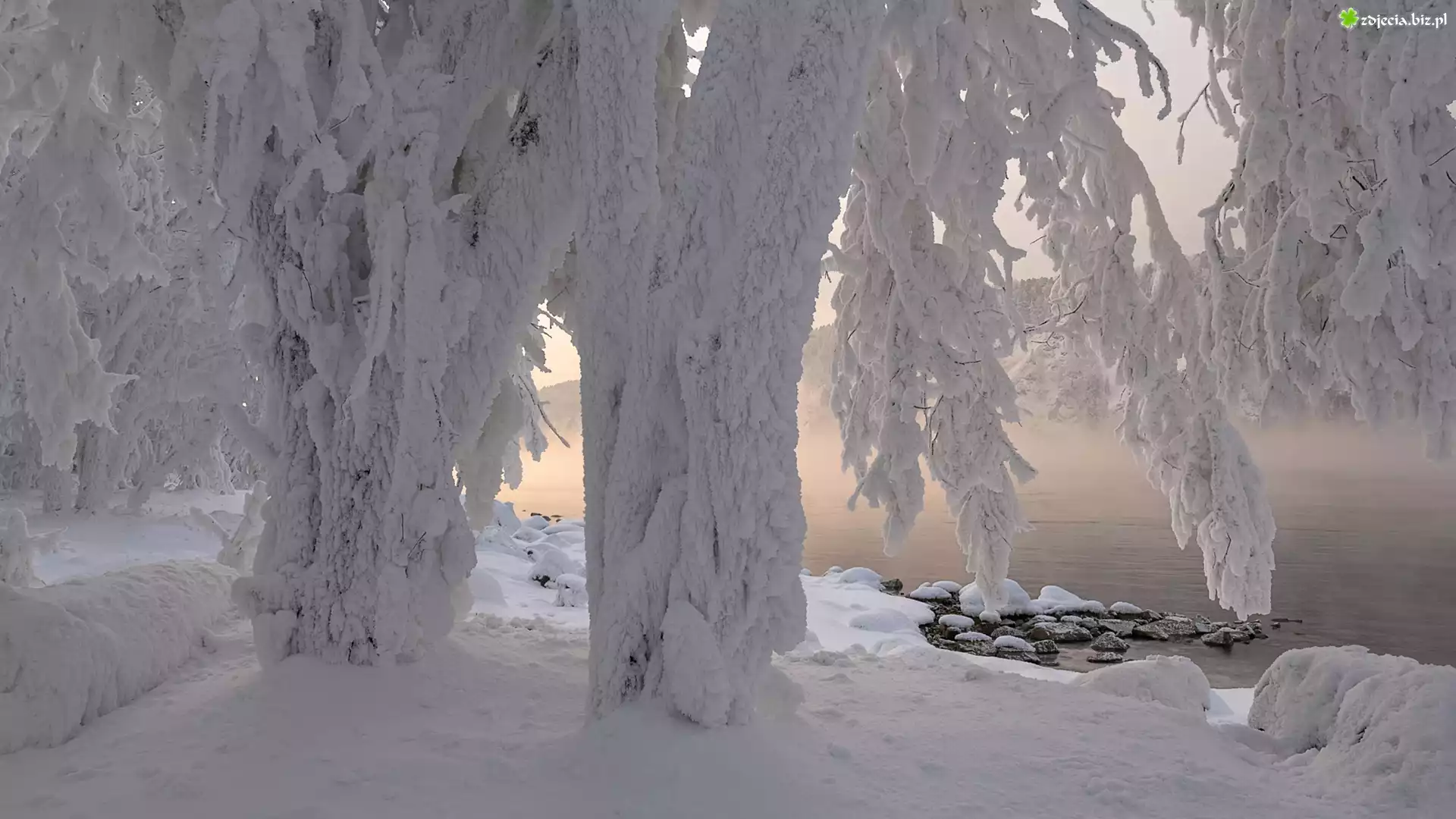 Zdjęcie Ośnieżone, Drzewa, Zima, Jezioro, Kamienie, Mgła