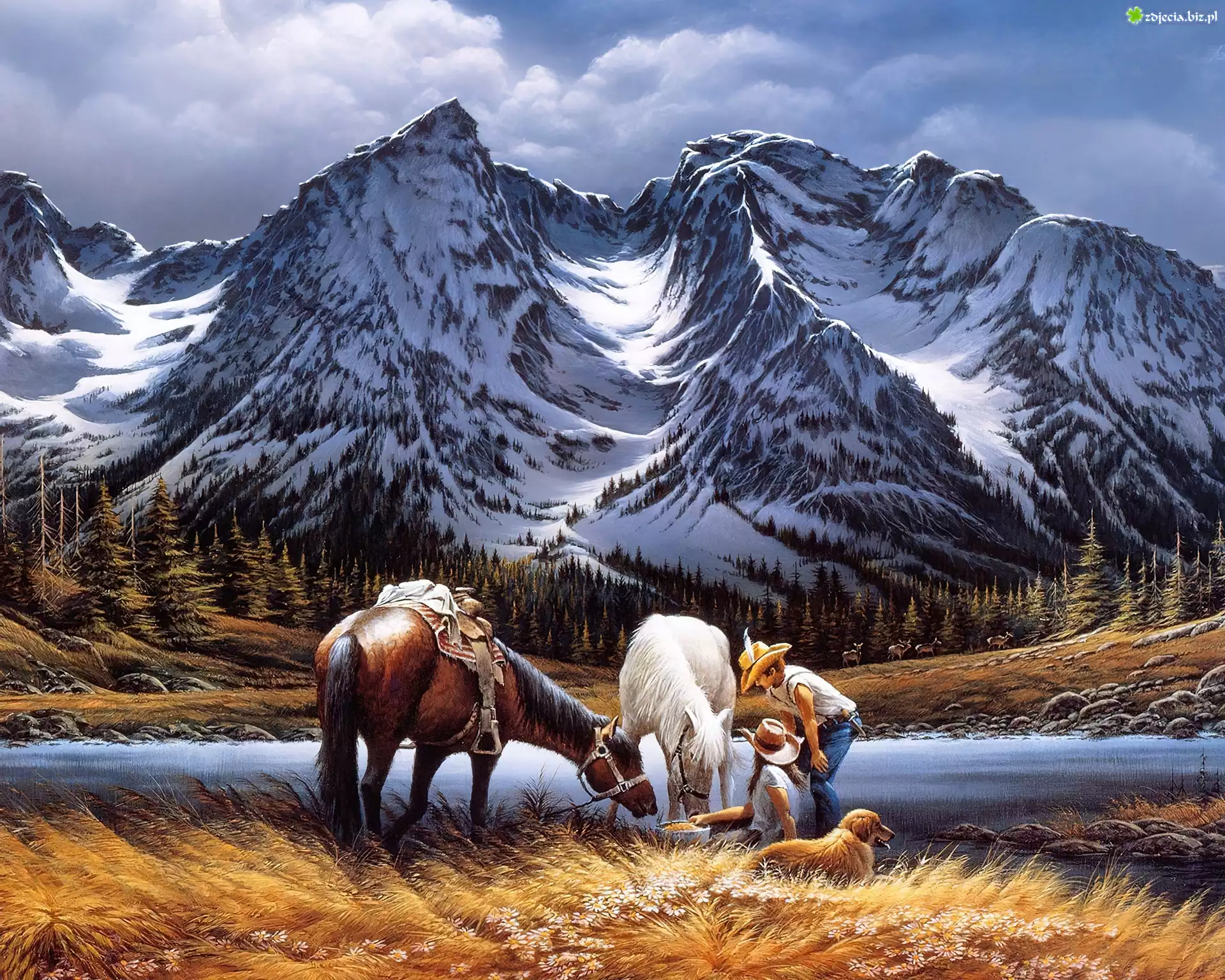 Zdjęcie Ośnieżone, Góry, Łąka, Konie, Malarstwo