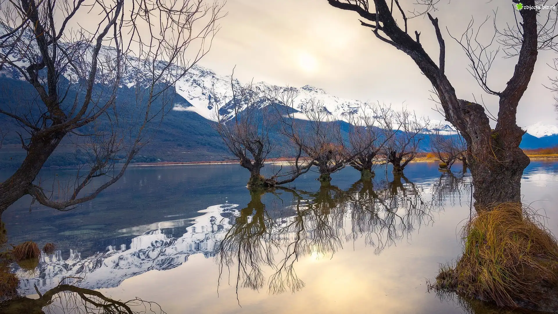 Zdjęcie Ośnieżone, Góry, Rzeka, Dart River, Drzewa, Odbicie, Glenorchy, Nowa Zelandia