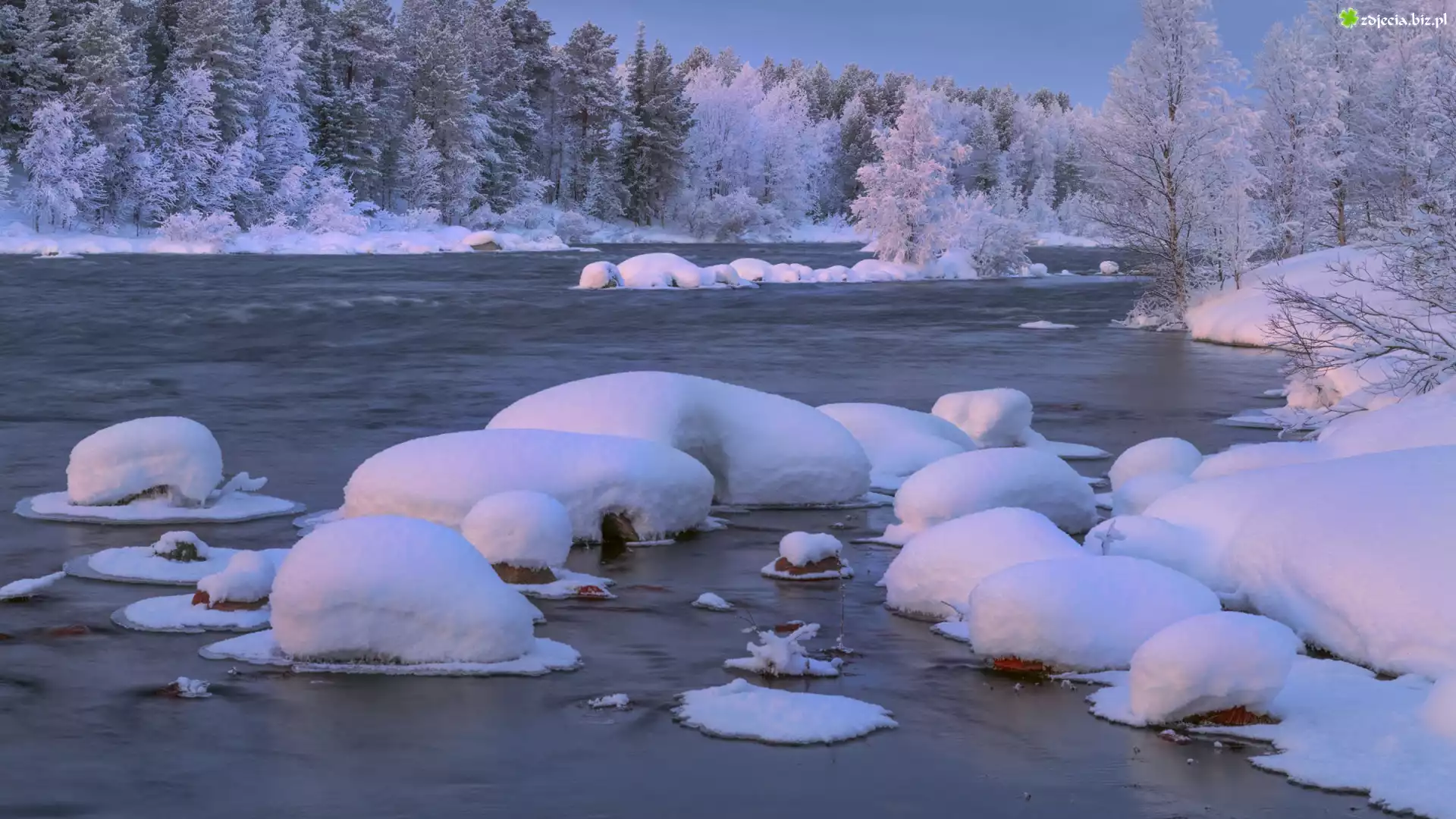 Zdjęcie Zima, Śnieg, Las, Ośnieżone, Drzewa, Rzeka