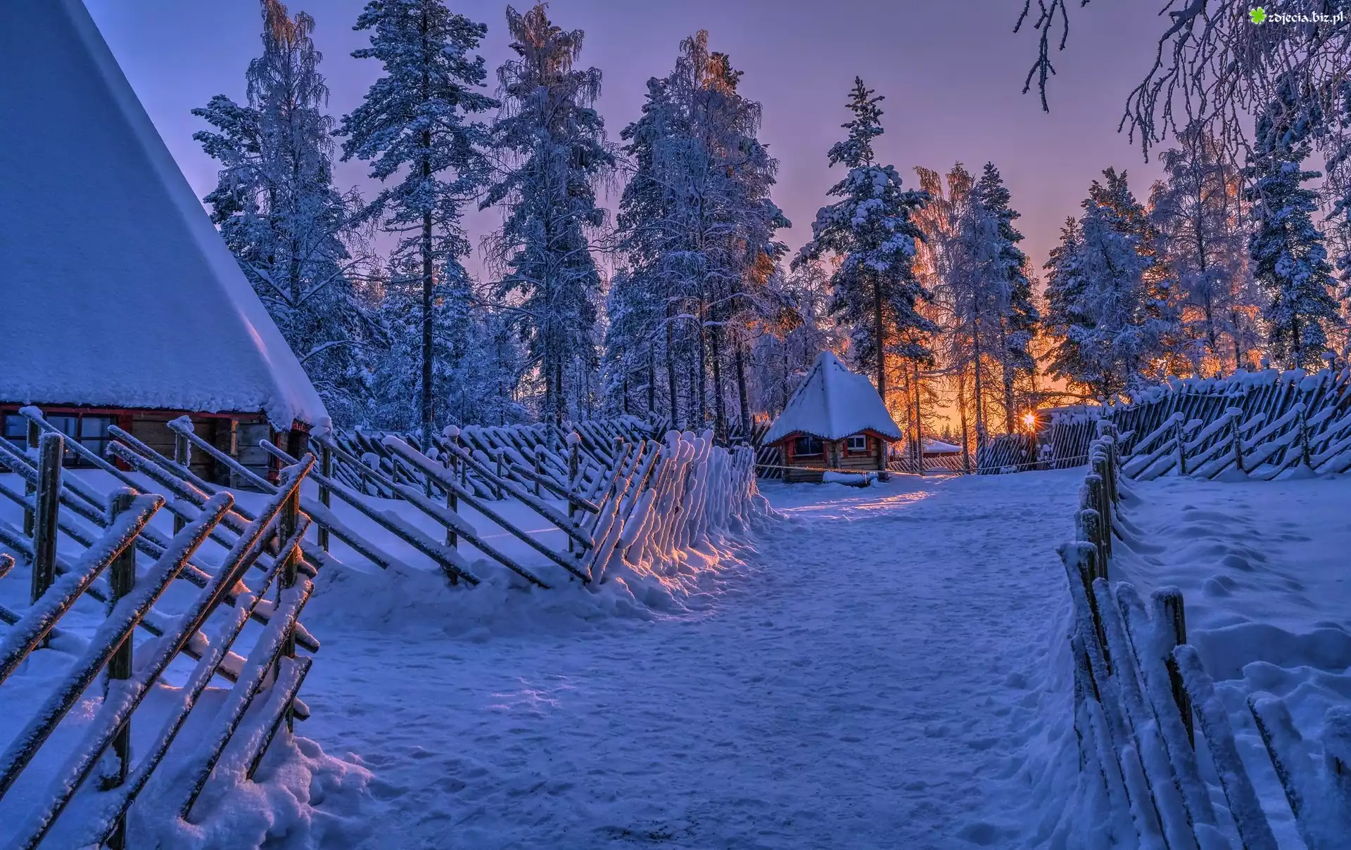 Zdjęcie Zima, Zachód słońca, Ośnieżone, Drzewa, Domki, Ogrodzenie
