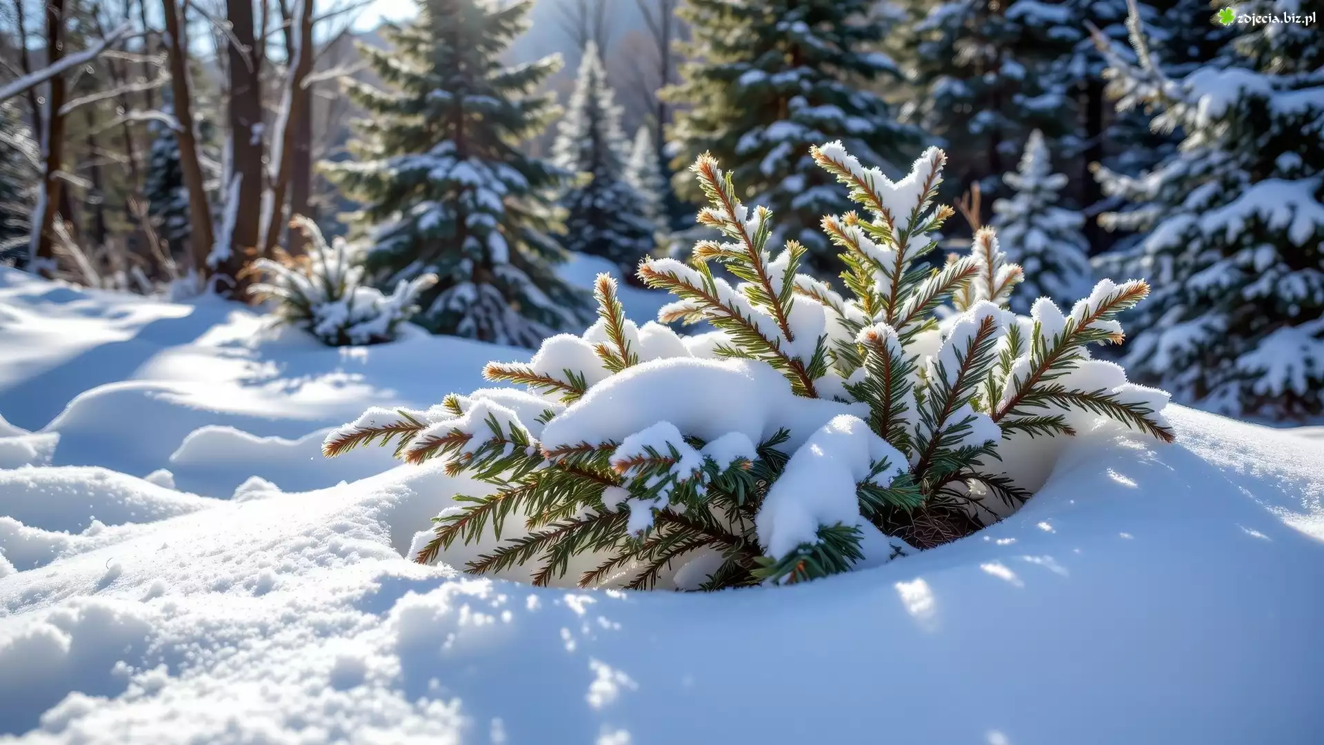 Zdjęcie Zima, Las, Śnieg, Ośnieżone, Gałązki, Iglaki, Drzewa