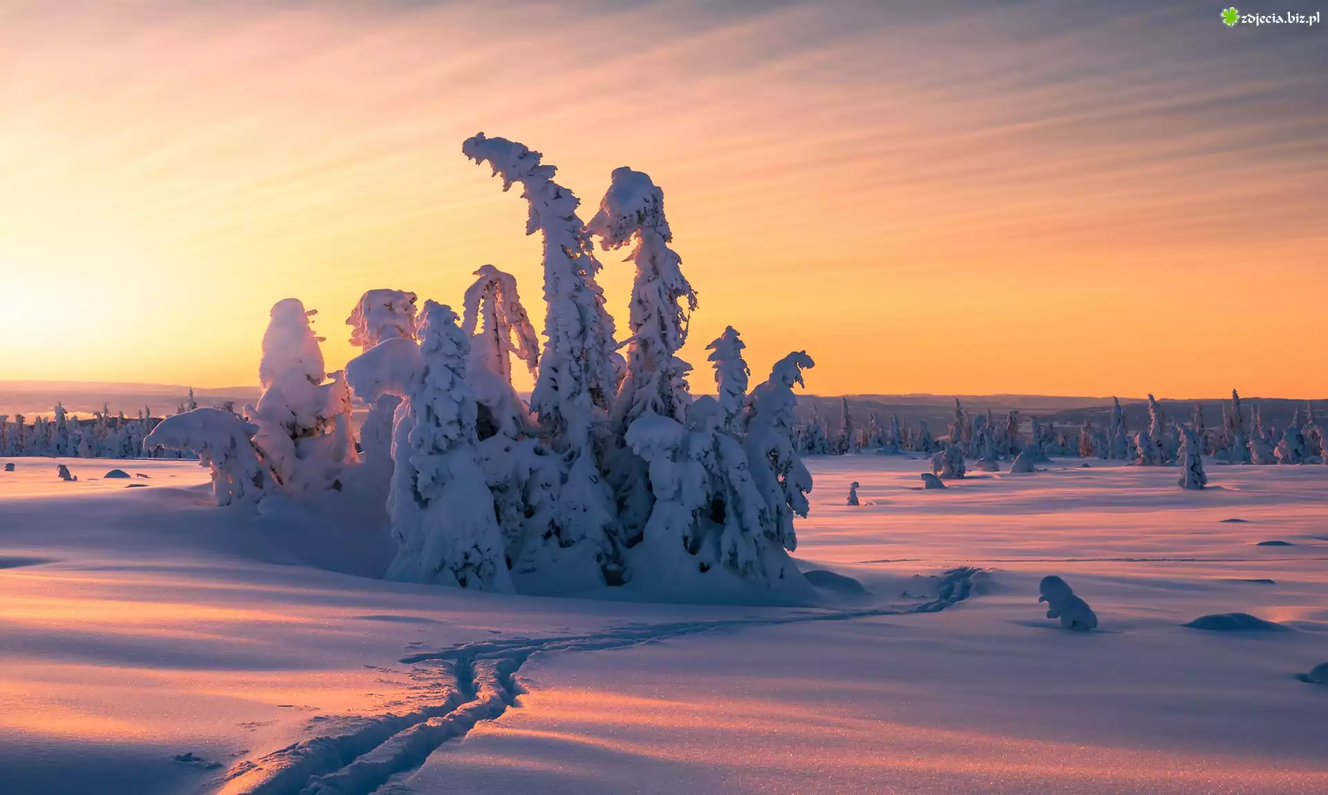 Zdjęcie Zima, Ślady, Śnieg, Ośnieżone, Drzewa, Wschód słońca