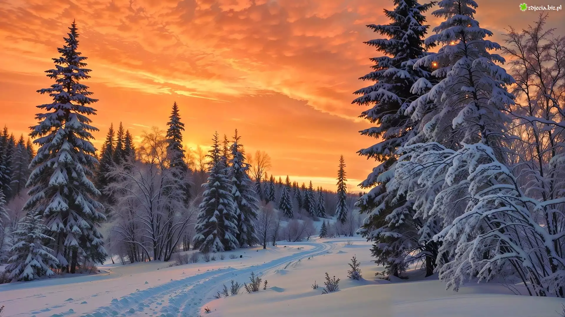 Zdjęcie Zima, Zachód słońca, Ośnieżony, Las, Drzewa, Droga