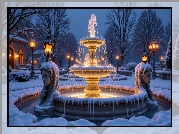 Zdjęcie, Zima, Fontanna, Figury, Oświetlone, Latarnie, Śnieg, Drzewa
