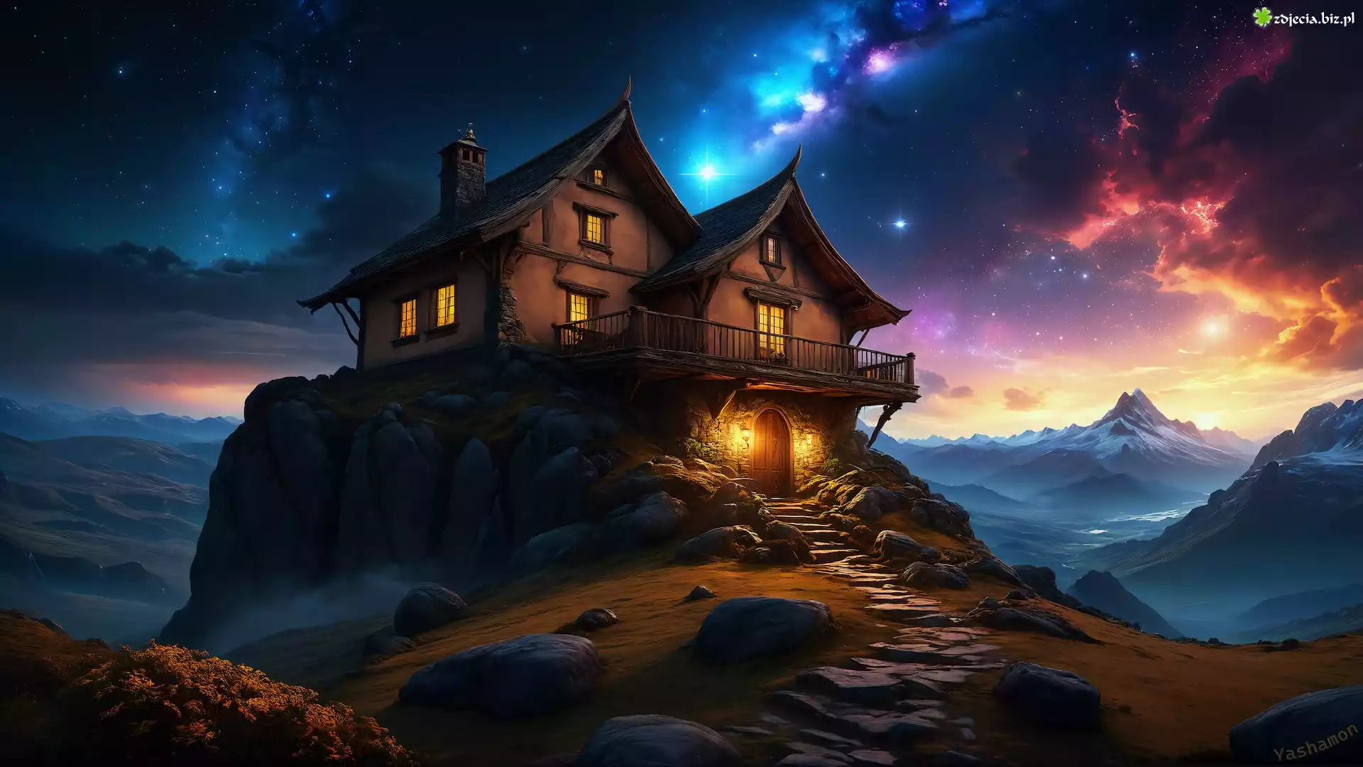 Zdjęcie Grafika, Góry, Dom, Oświetlony