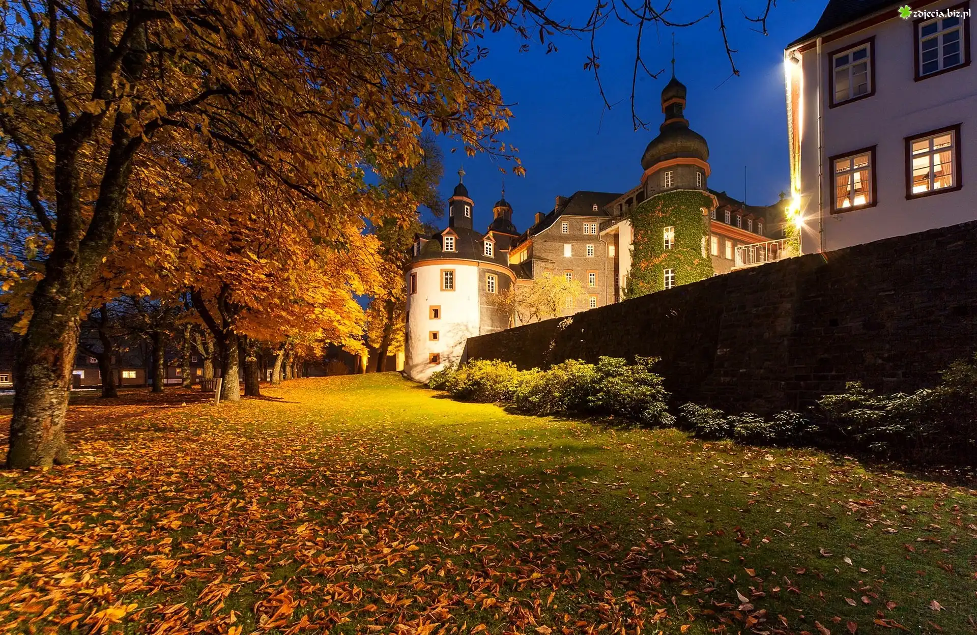 Zdjęcie Oświetlony, Zamek Berleburg, Miasto Bad Berleburg, Niemcy, Jesień