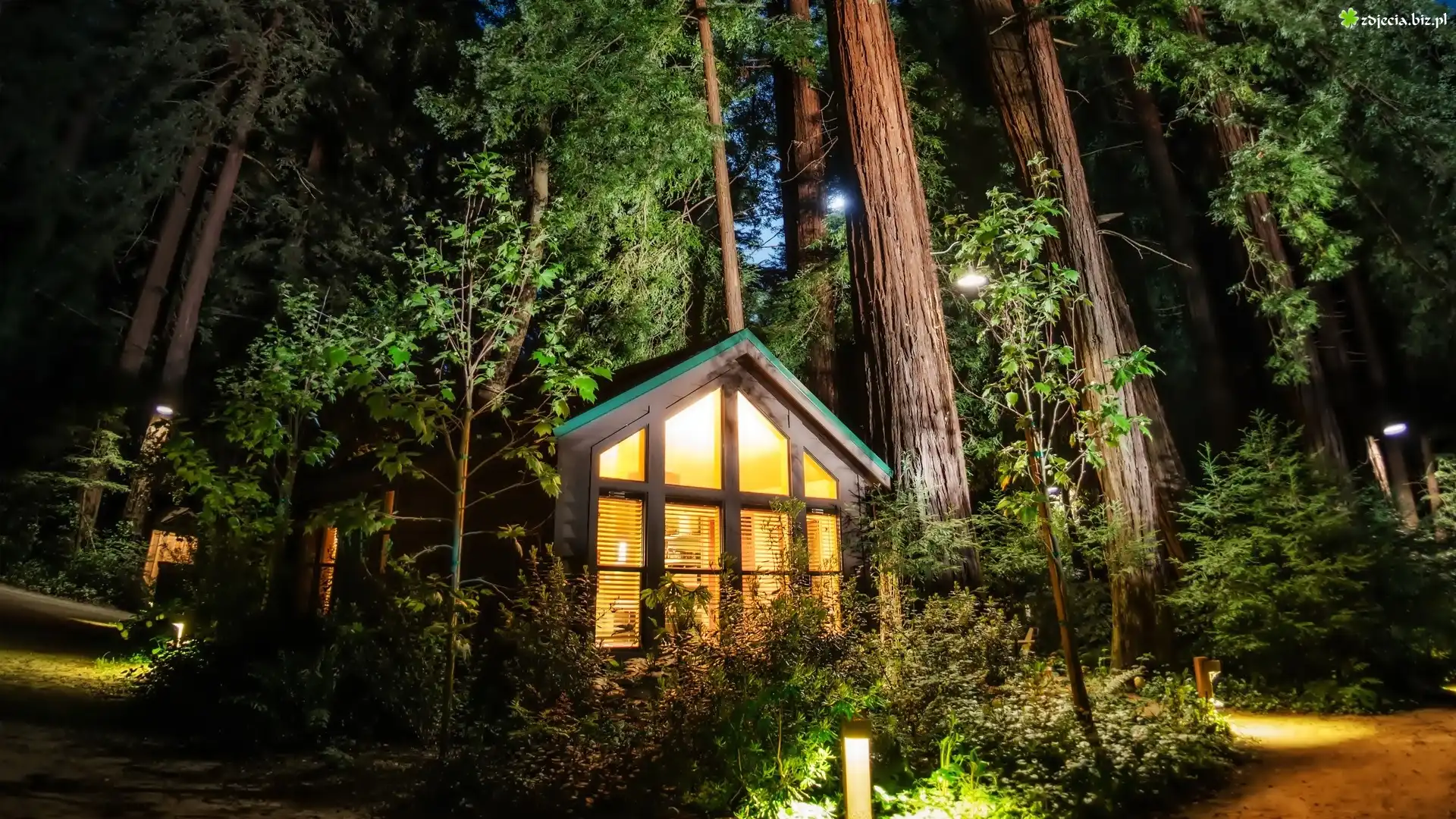 Zdjęcie, Oświetlony, Dom, Las, Wieczór