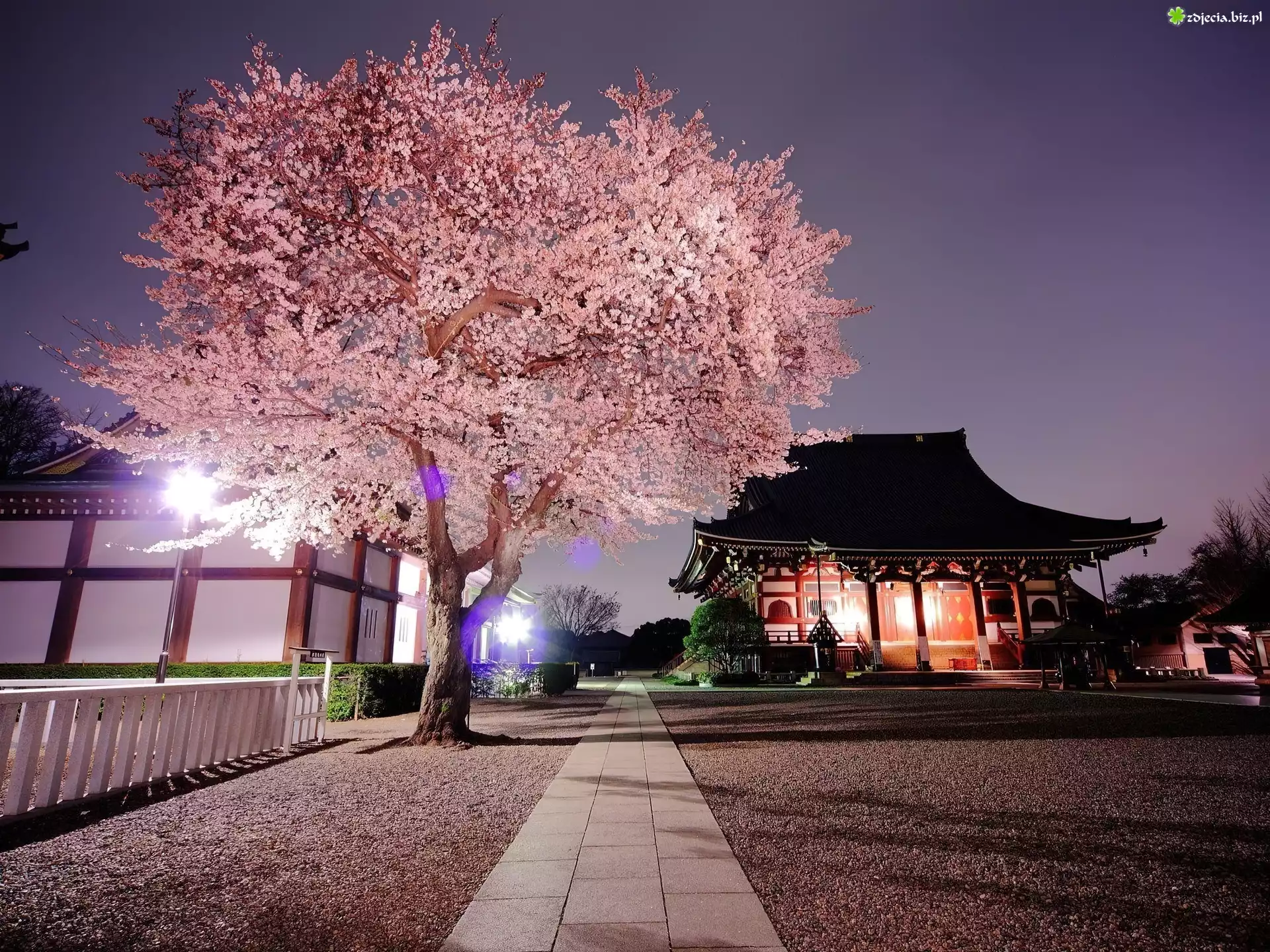 Zdjęcie Japonia, Oświetlony, Domek, Kwitnące, Drzewo, Wiśnia, Chodnik, Wieczór