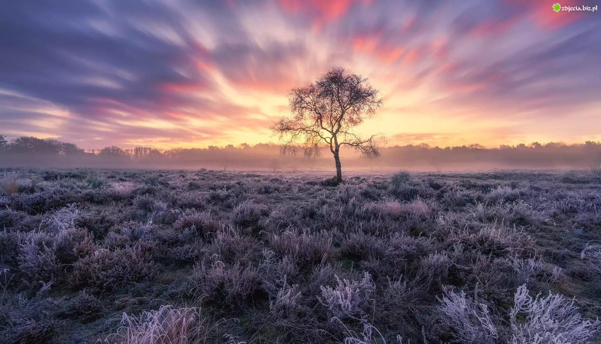 Zdjęcie Drzewo, Oszroniona, Trawa, Szron, Wschód słońca, Wrzosowisko