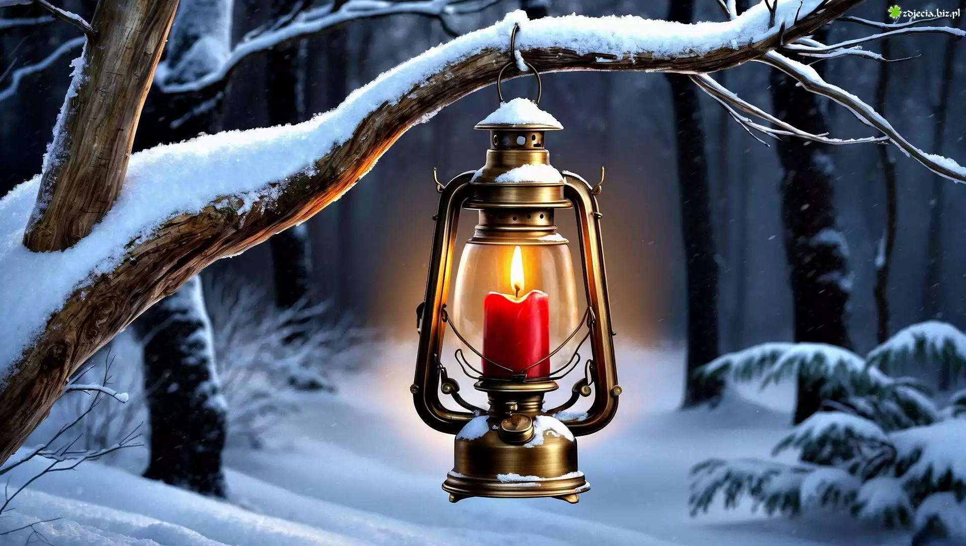Zdjęcie Las, Zima, Drzewa, Oszronione, Gałęzie, Lampion, Grafika