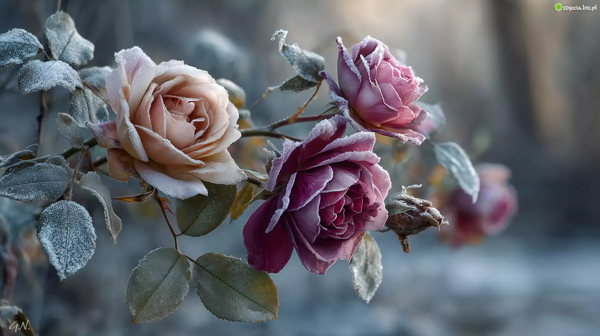 Zdjęcie Róże, Oszronione, Kwiaty, Grafika AI