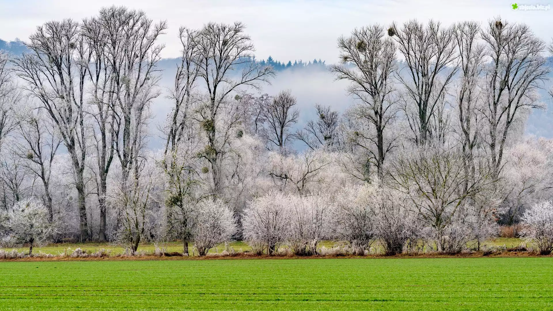 Zdjęcie Zima, Pole, Drzewa, Oszronione, Krzewy, Mgła