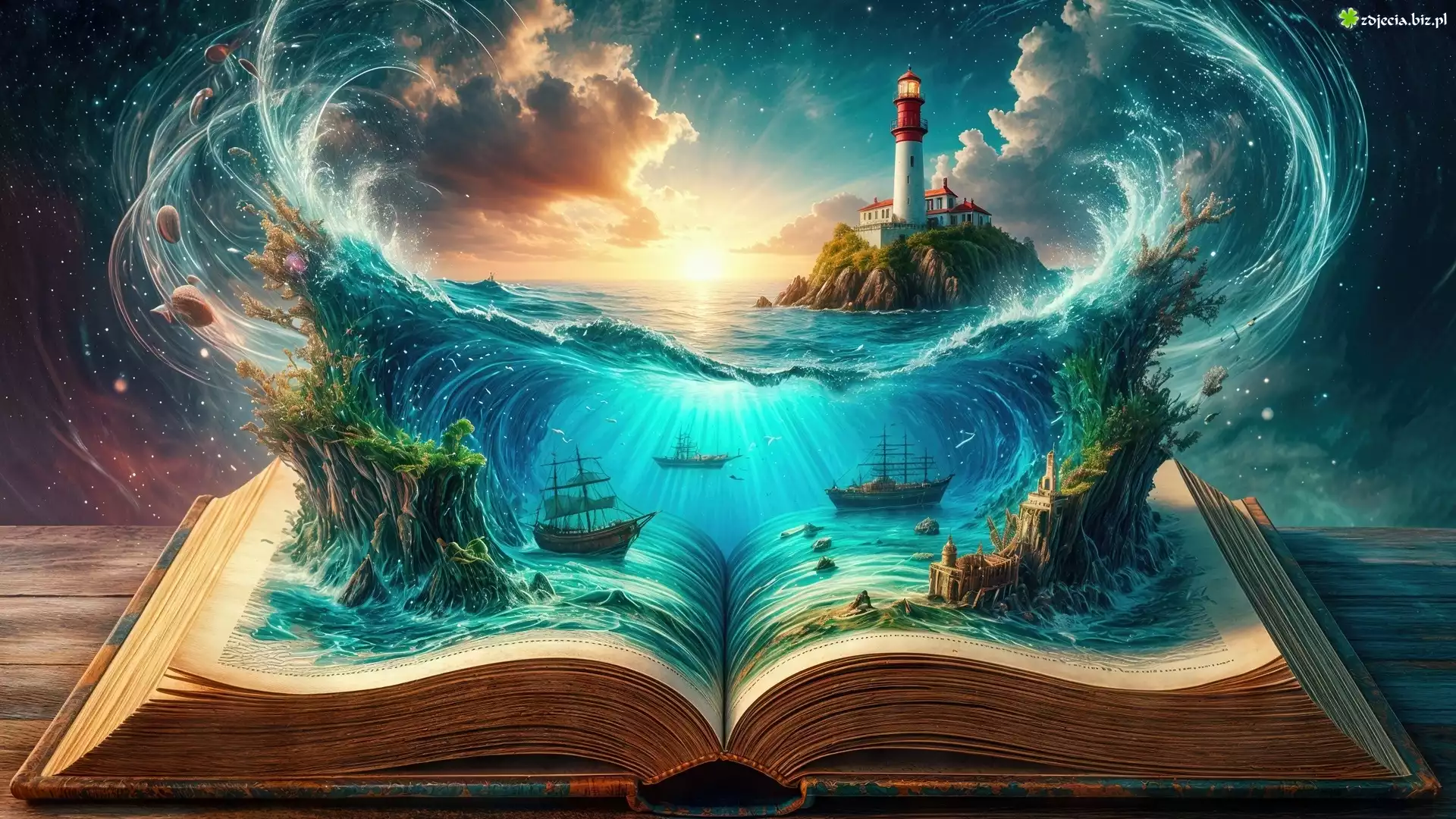 Zdjęcie Otwarta, Książka, Magiczny, Świat, Morze, Latarnia, Wyspa, Statki, Grafika 4D