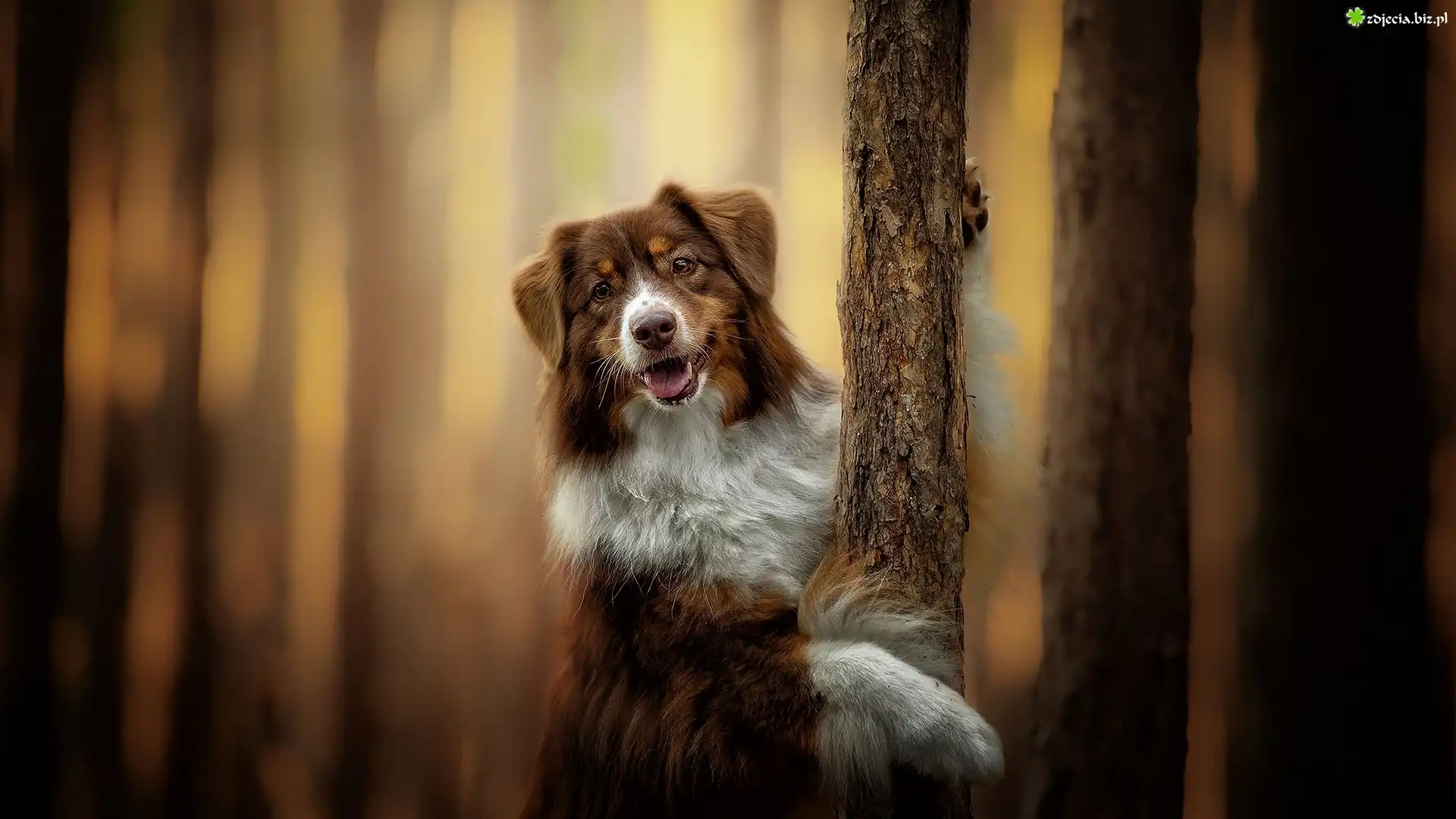 Zdjęcie, Owczarek australijski, Drzewa, Rozmyte tło