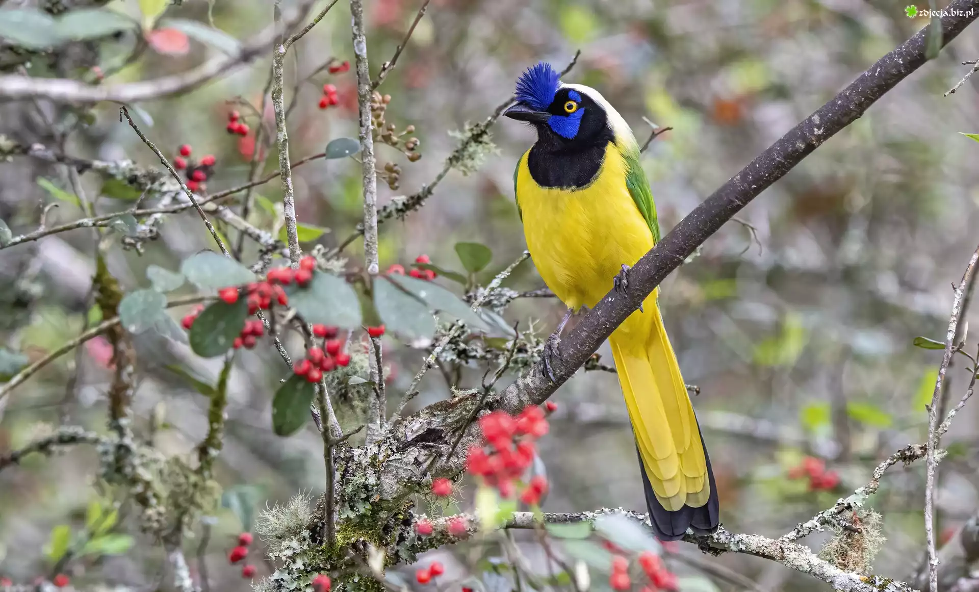 Zdjęcie Modrowronka zielona, Inca Jay, Ptak, Gałęzie, Czerwone, Owoce
