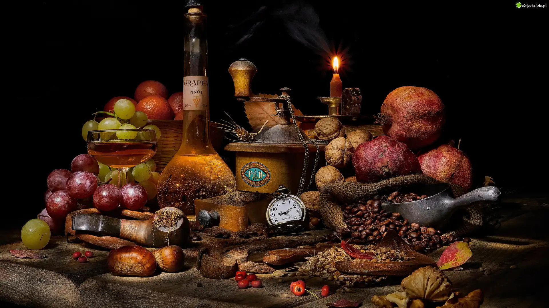Zdjęcie Kompozycja, Owoce, Zegar, Kawa, Świeczka, Butelki, Orzechy