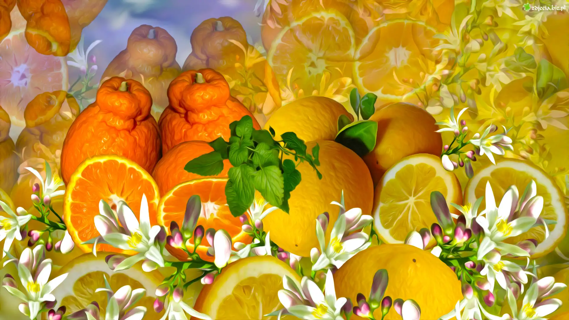 Zdjęcie Owoce, Mandarynki, Cytryny, Kwiaty, Mięta