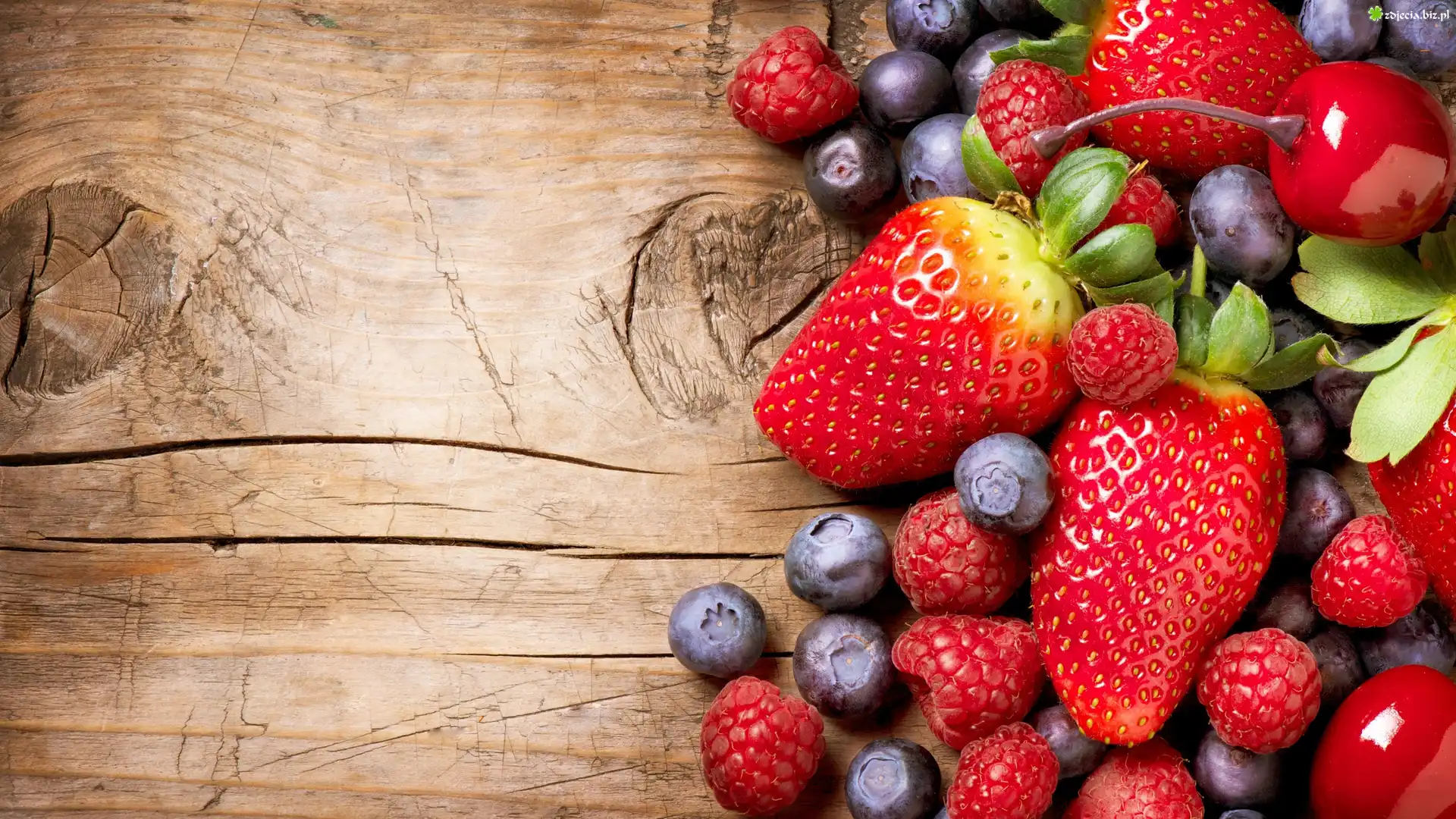Zdjęcie Owoce, Truskawki, Borówki, Maliny, Deski