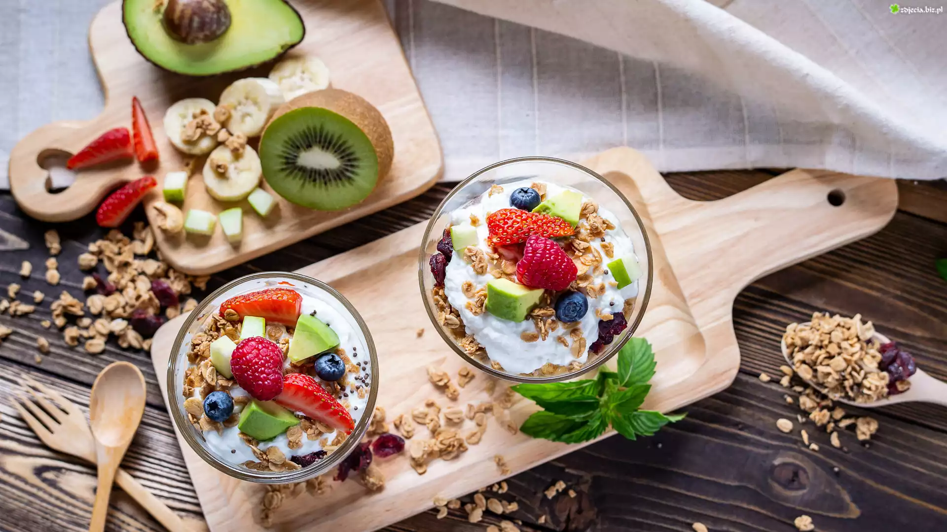 Zdjęcie, Śniadanie, Owsianka, Jogurt, Owoce, Deski