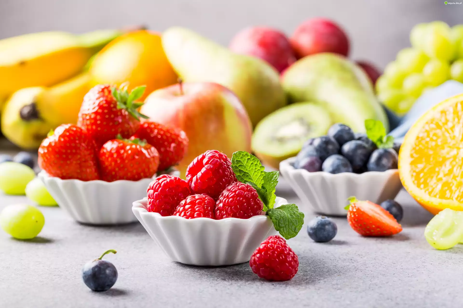Zdjęcie Owoce, Maliny, Truskawki, Miseczki