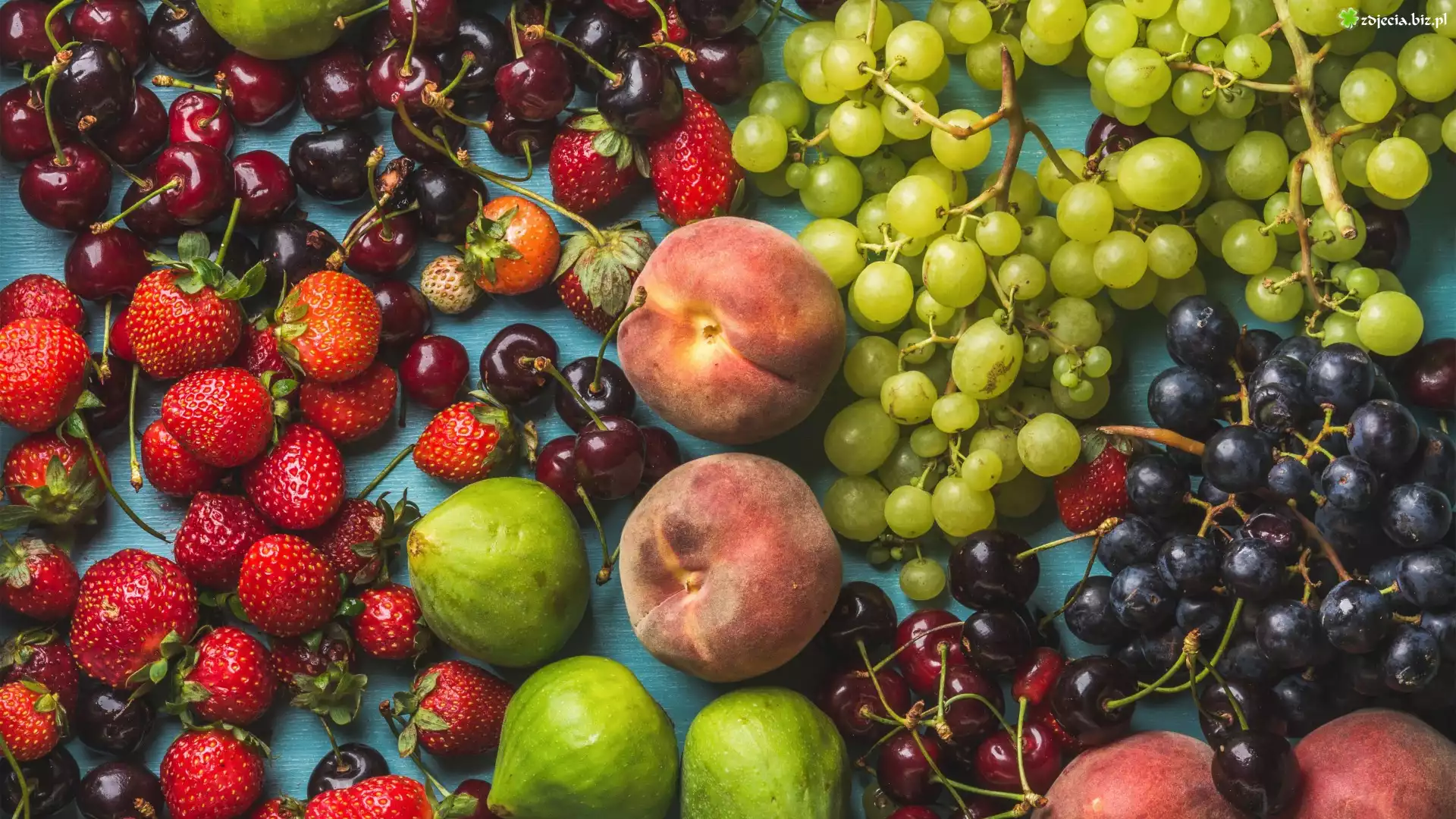 Zdjęcie Owoce, Wiśnie, Truskawka, Winogrona, Brzoskwinie