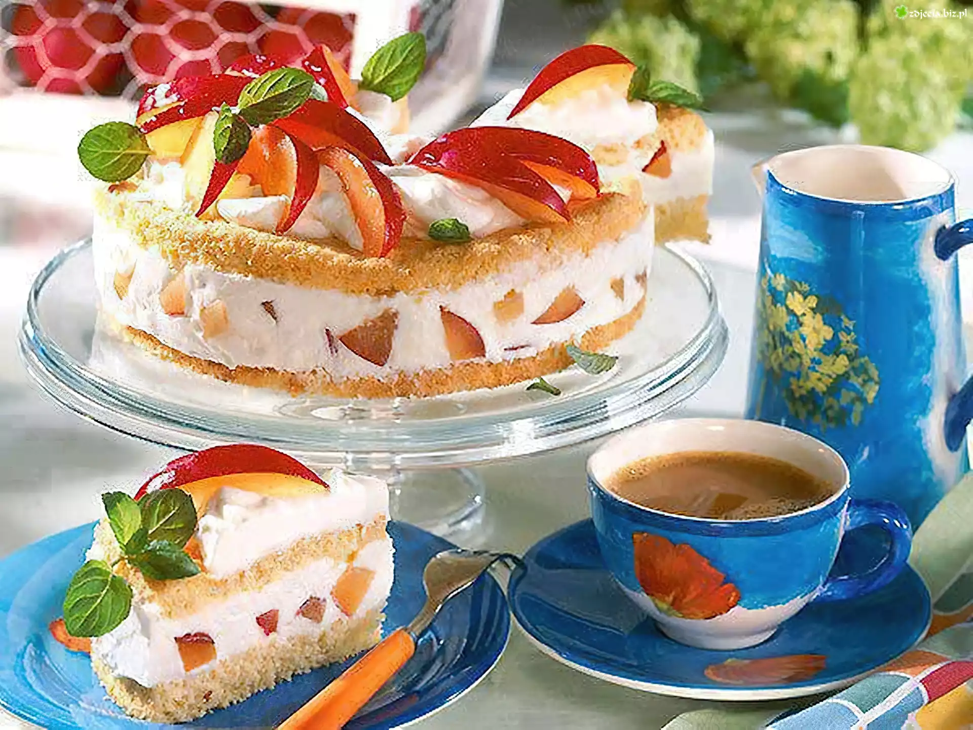 Zdjęcie, Ciasto, Owocowe, Owoce, Talerze, Dzbanek, Widelec, Filiżanka