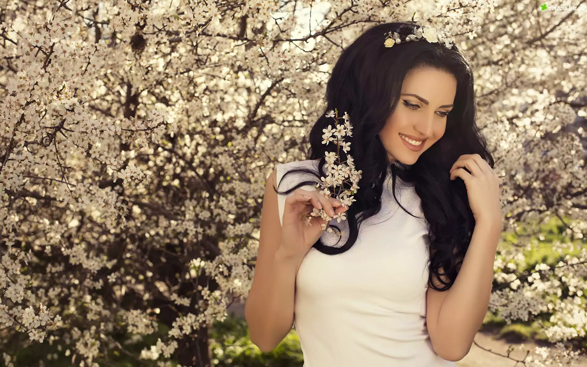 Zdjęcie Drzewo owocowe, Gałązki, Kwiaty, Kobieta, Uśmiech, Długowłosa