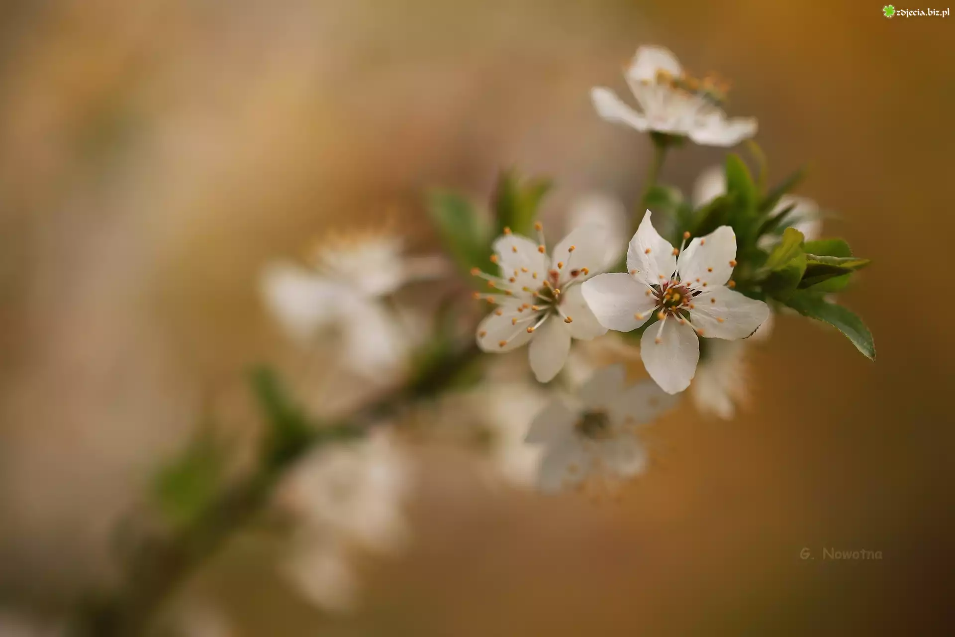 Zdjęcie, Białe, Kwiaty, Drzewo owocowe, Gałązka, Zielone, Liście