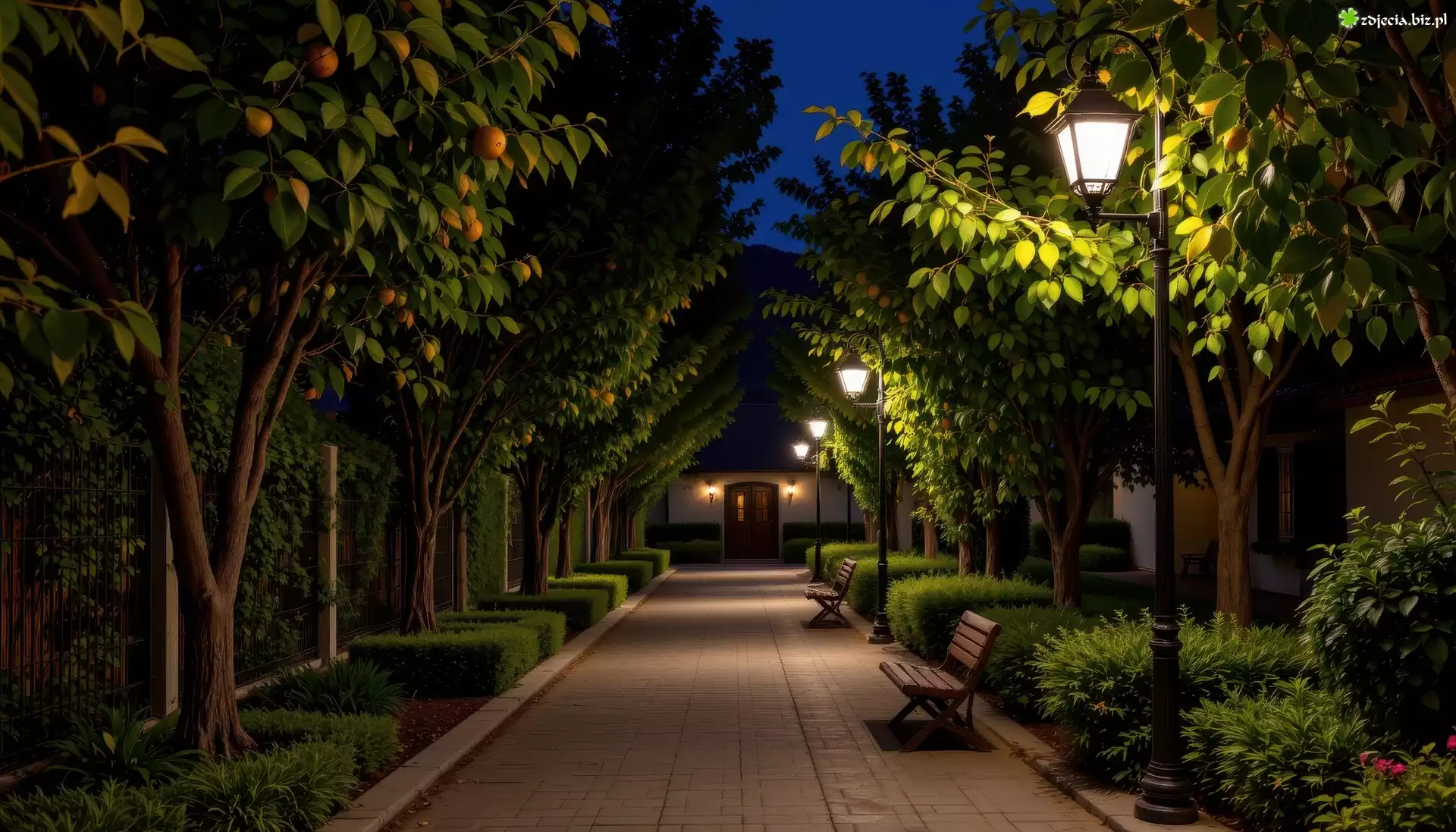 Zdjęcie, Drzewa owocowe, Ławki, Latarnie, Aleja