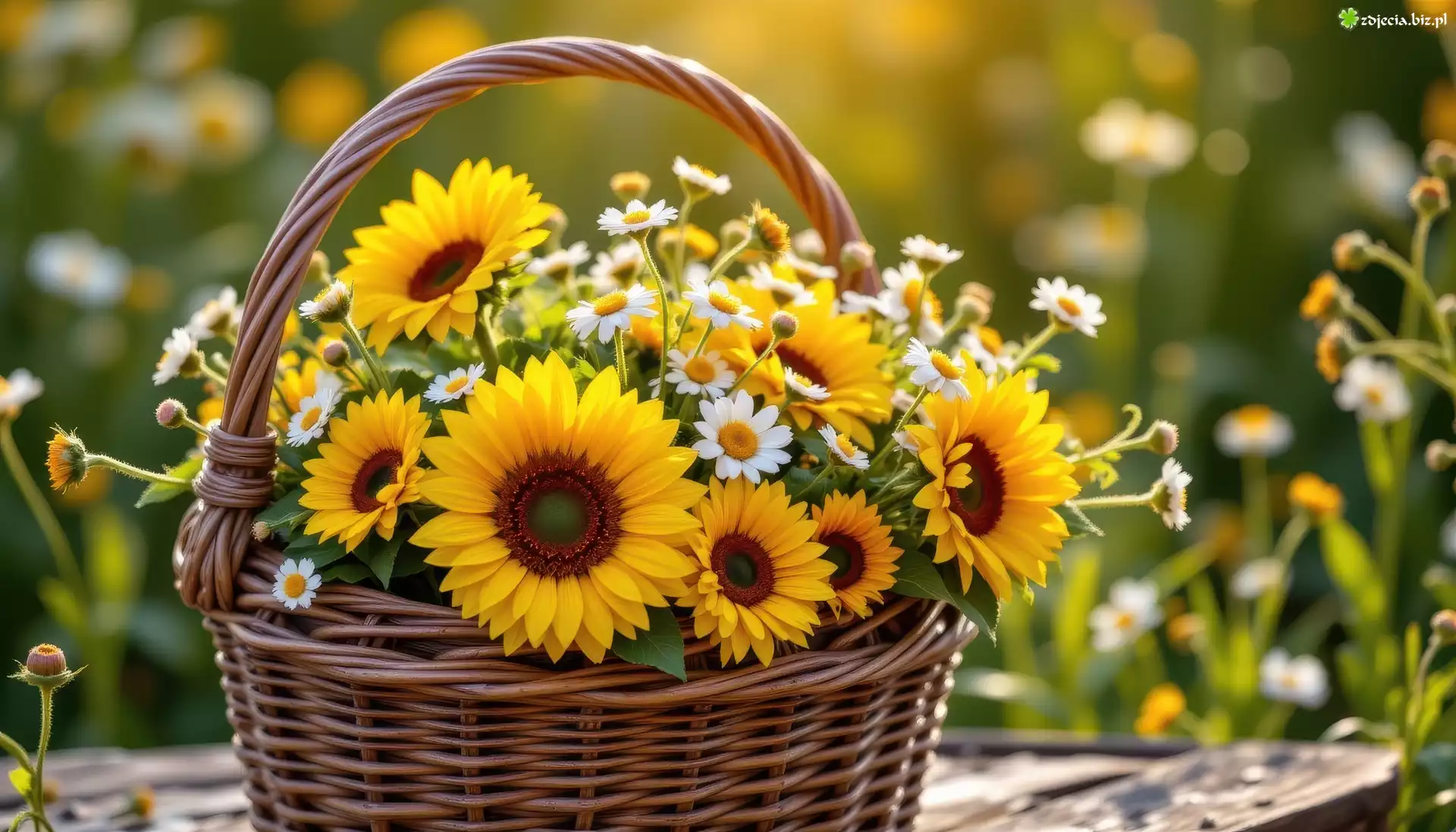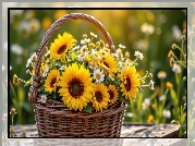 Zdjęcie, Słoneczniki ozdobne, Stokrotki, Wiklinowy, Koszyk
