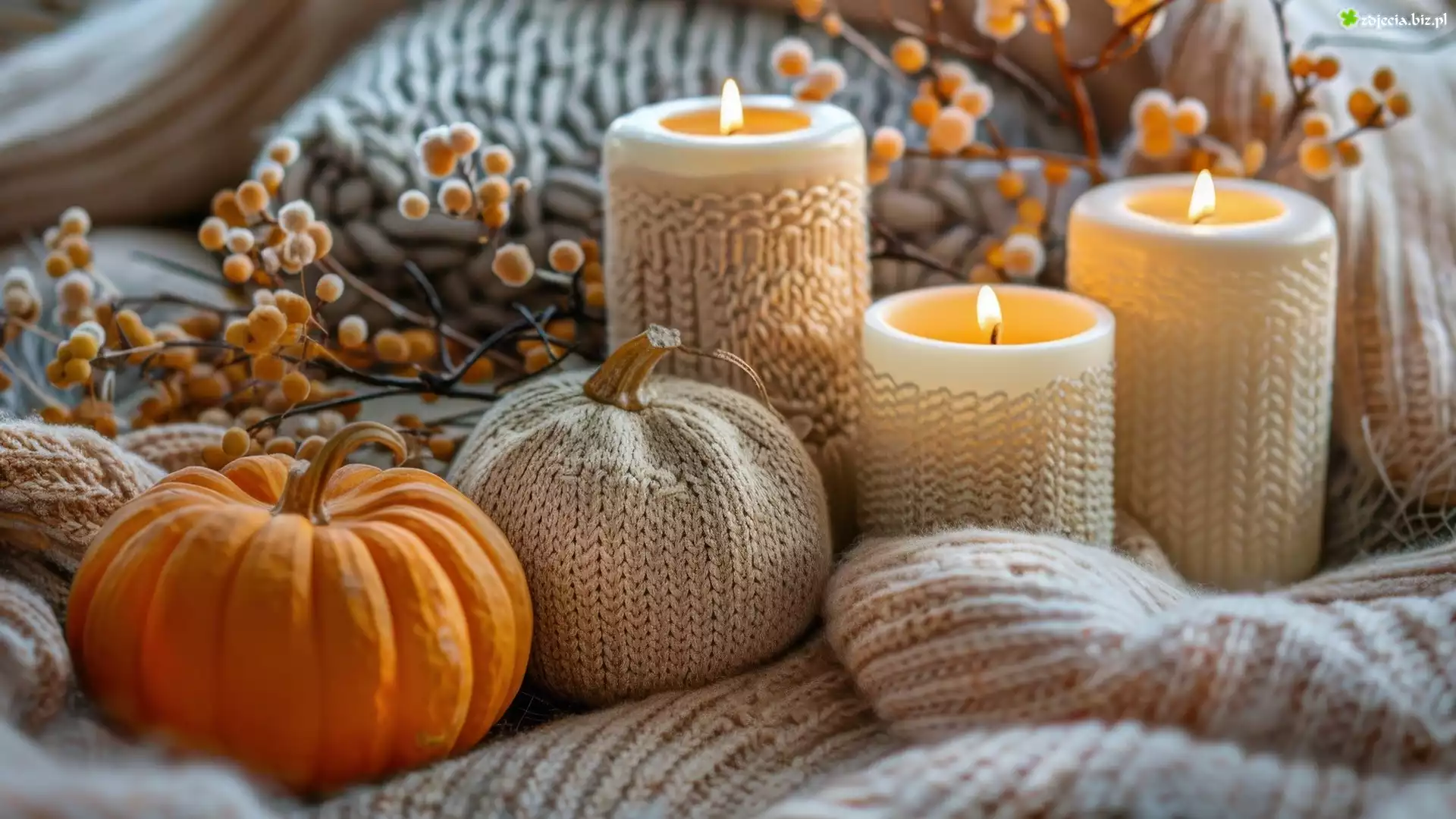 Zdjęcie Dynie, Świece, Wełniane, Ozdoby, Gałązki, Kompozycja, AI