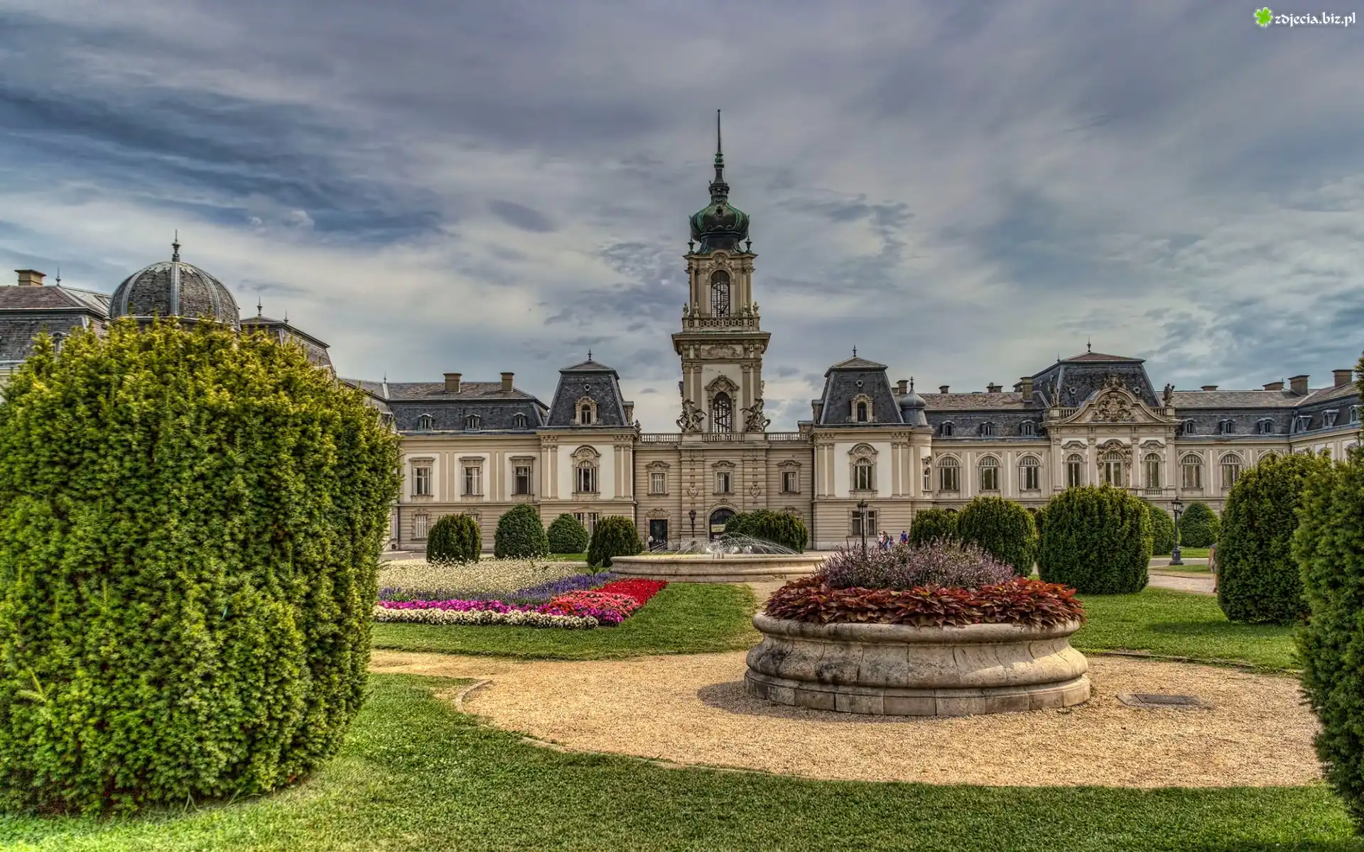 Miasto, Wieczór, Chmury Dom, Witraże, Palmy Latarnia, Morska Fontanna, Neptuna, Park Schönbrunn Big Ben, Nocą, Pałac, Westminsterski, Londyn Czerwone, Domki, Wąska, Rzeczka Chatka, Wzgórze, Łąka Pierrefonds, Zamek, Francja Latarnia, Różowe, Chmury Hotel, Coronado,  Kwiaty, Trawnik Świąteczny, Wystrój, Dom Filary, Arkady, Góry, Budowla Długie, Molo, Morze Fontanna, Wieża, Eiffla