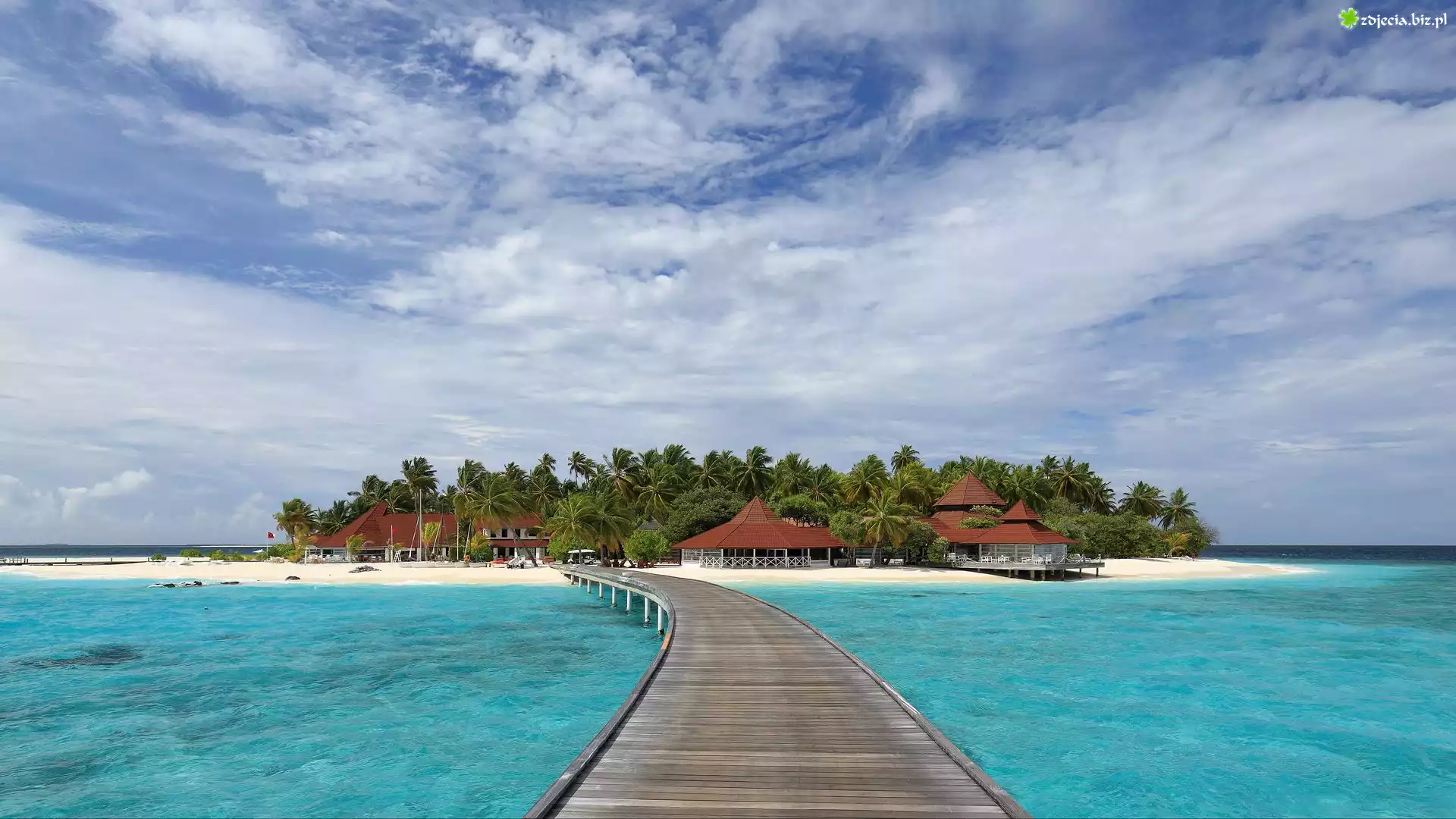 Zdjęcie Morze, Pomost, Plaża, Palmy, Wyspa, Domki