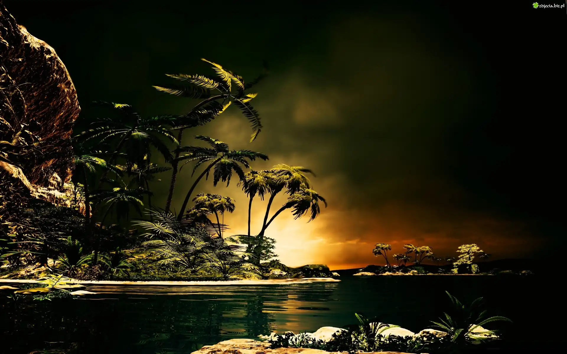 Zdjęcie, Jezioro, Palmy, Zmrok