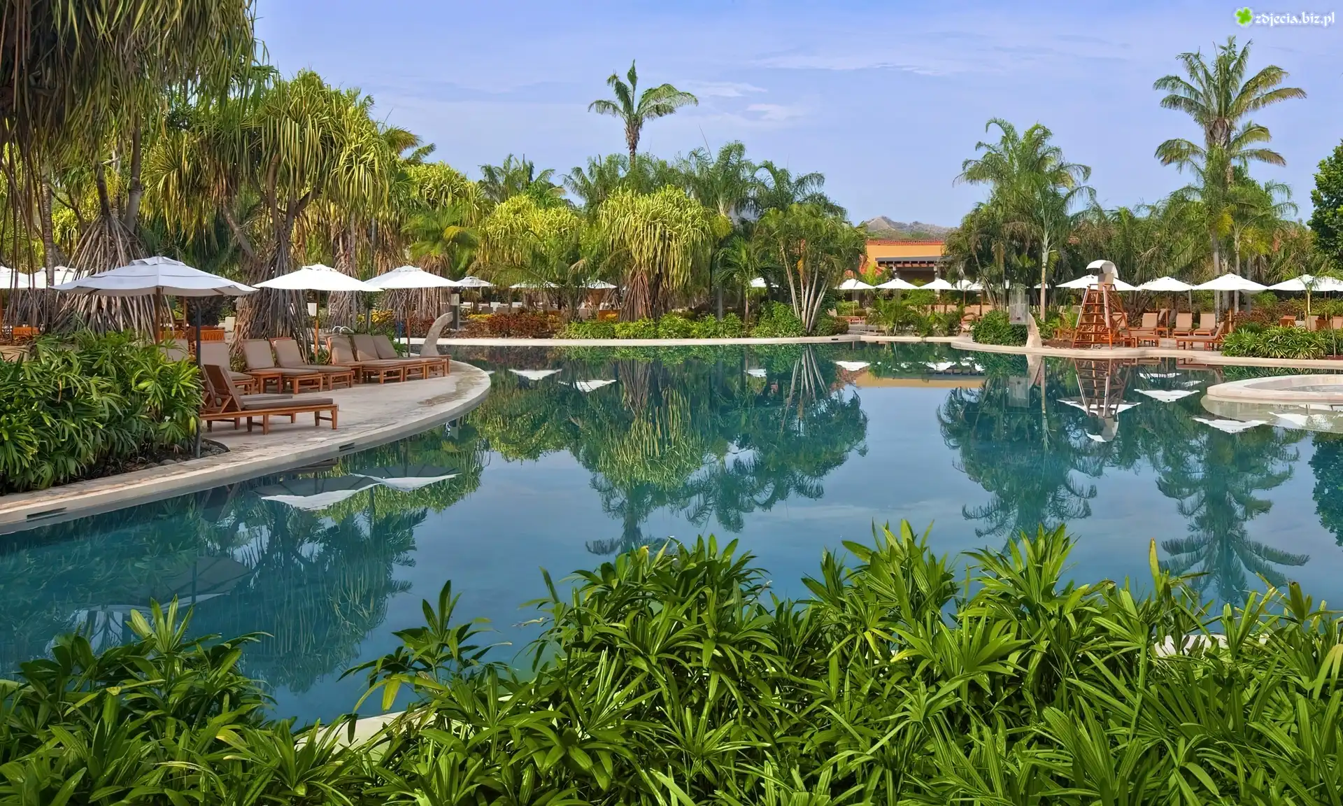 Zdjęcie Palmy, Parasole, Krzesła, Woda, Basen, Wakacje