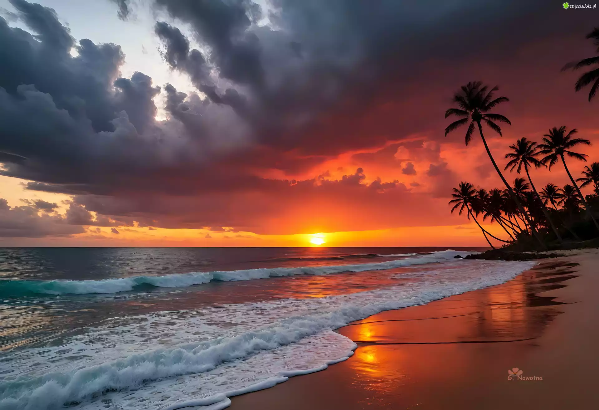 Zdjęcie, Ocean, Zachód słońca, Palmy, Niebo, Plaża, Grafika