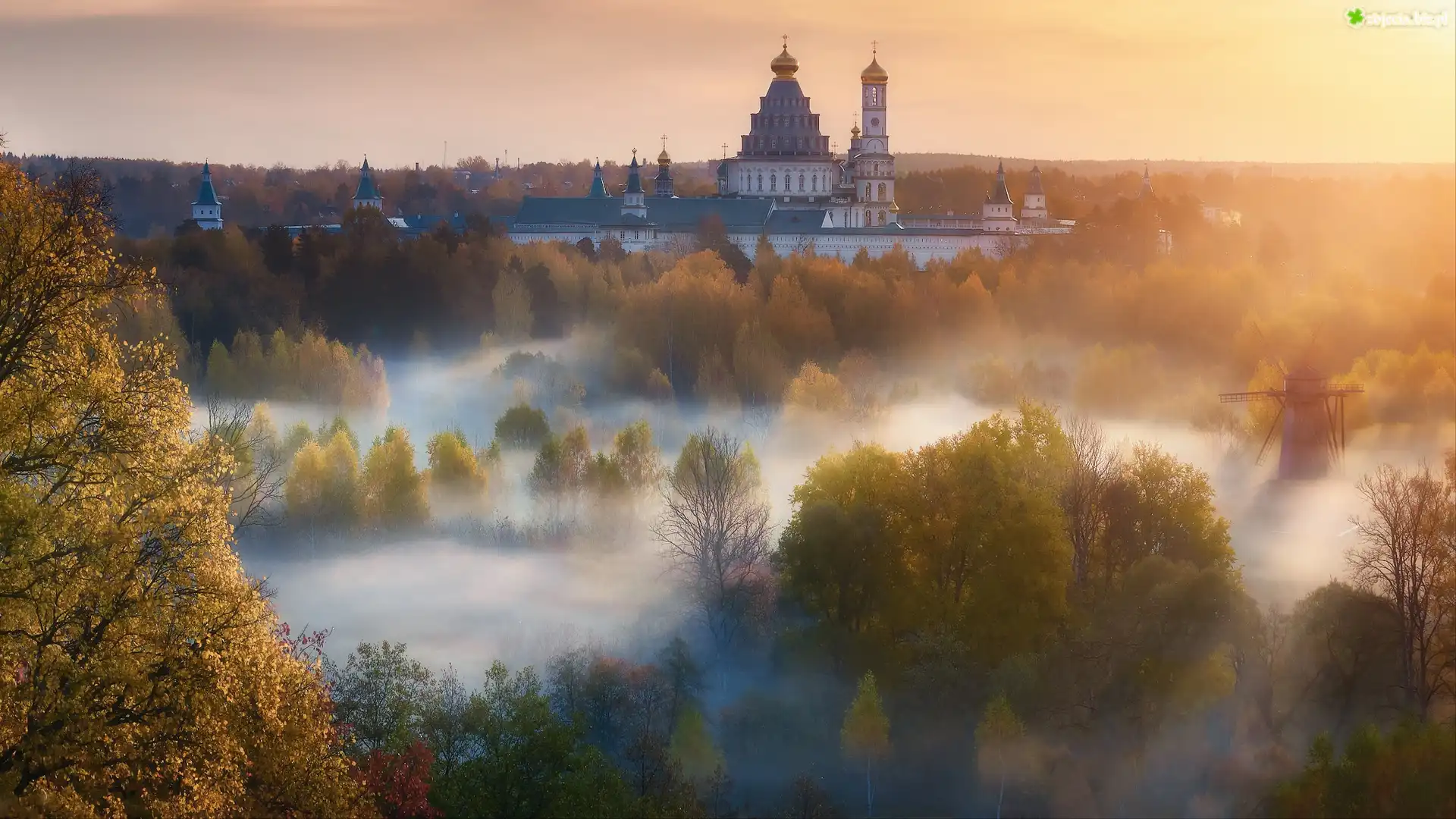Zdjęcie Jesień, Cerkiew, Monaster Zmartwychwstania Pańskiego, Nowe Jeruzalem, Lasy, Mgła, Wiatrak, Istra, Obwód moskiewski, Rosja |