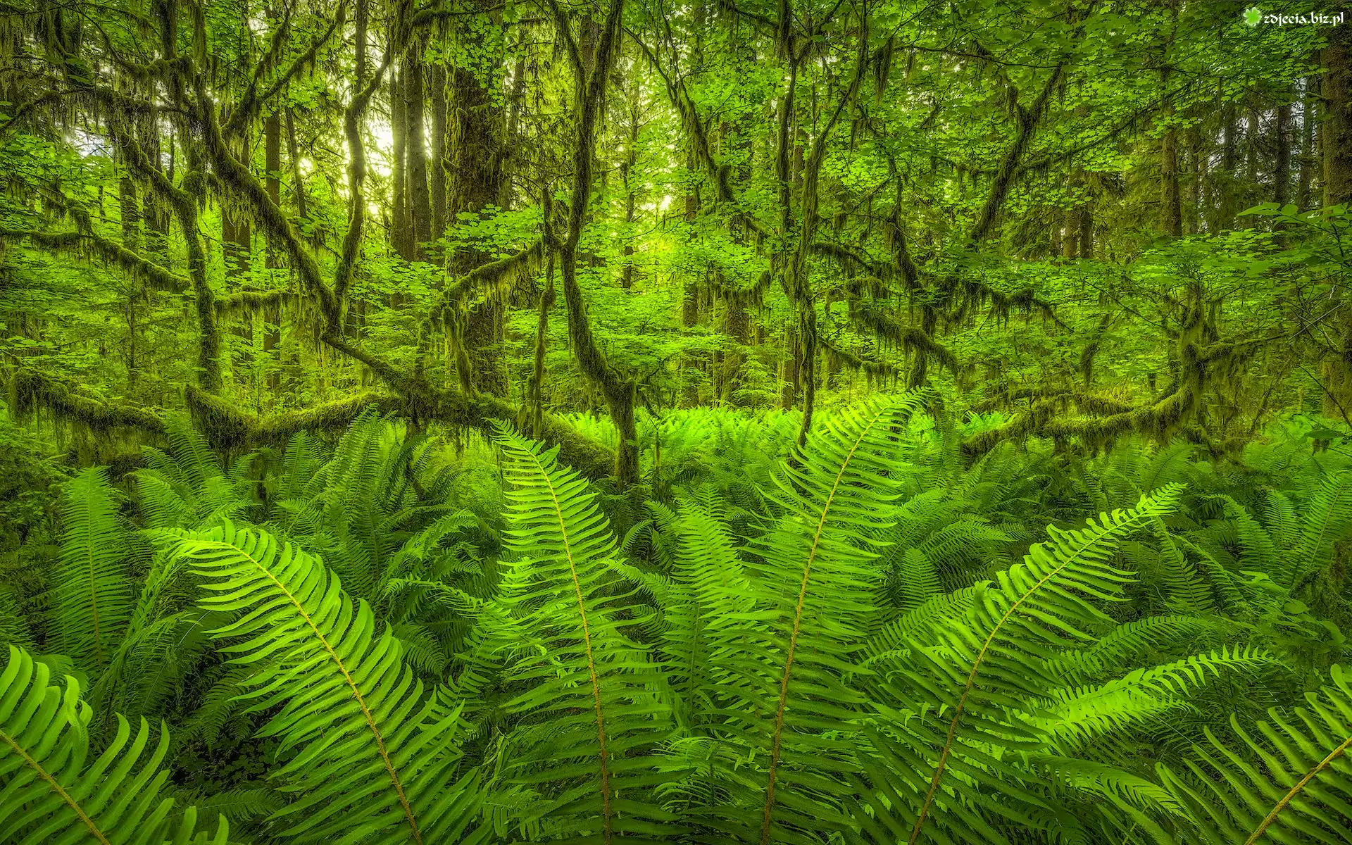 Zdjęcie Las, Paprocie, Drzewa, Gałęzie, Mech hiszpański, Oplątwa brodaczkowa