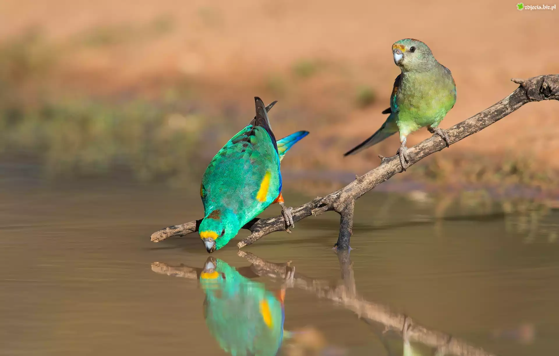 Zdjęcie Dwie, Papużki, Papugi, Świergotki wielobarwne, Patyk, Woda, Odbicie
