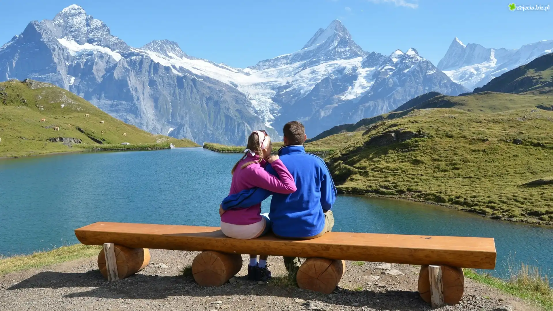 Zdjęcie Para, Miłość, Góry, Jezioro, Ławka, Trawa