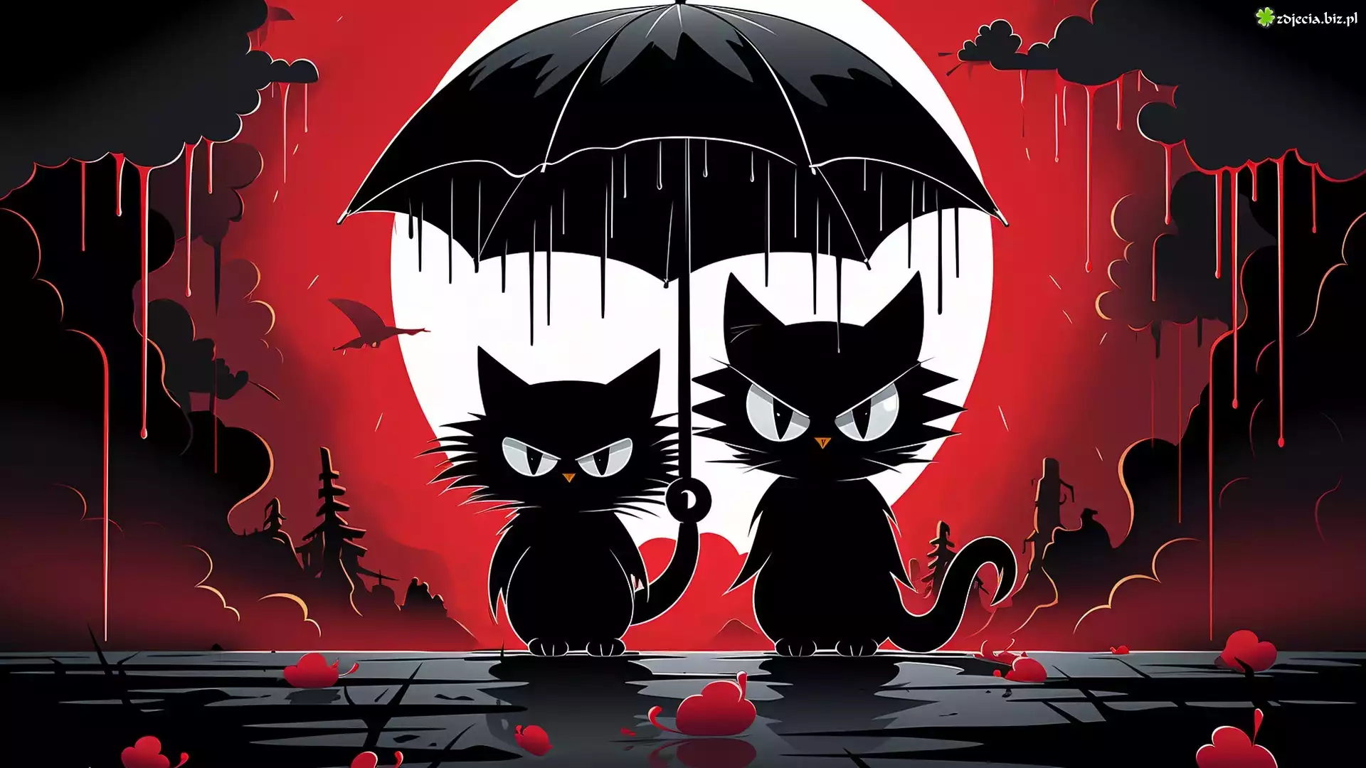Zdjęcie Grafika, Dwa, Koty, Parasolka, Padający, Deszcz