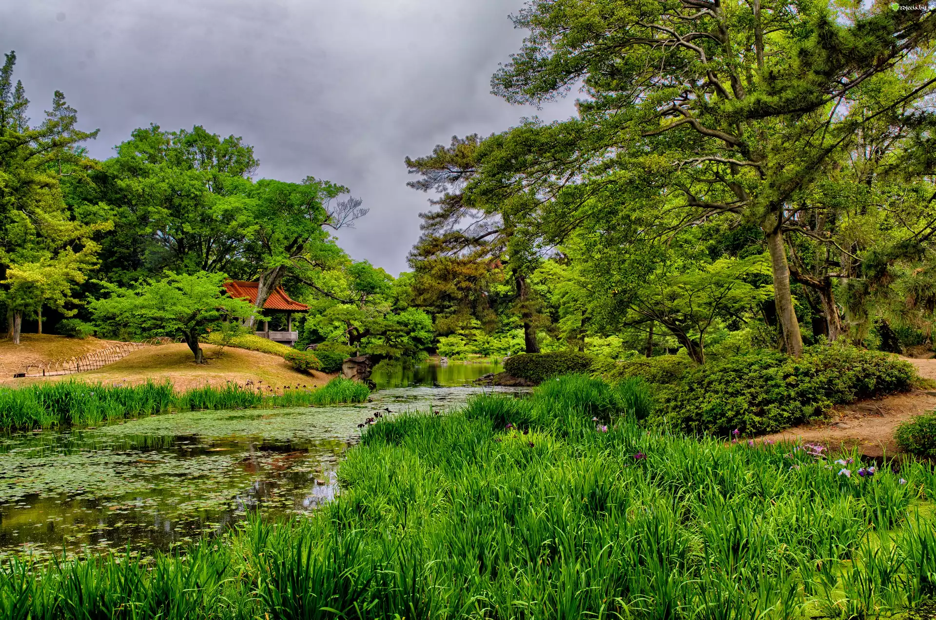 Zdjęcie, Park, Staw, Domek, Altanka, Drzewa