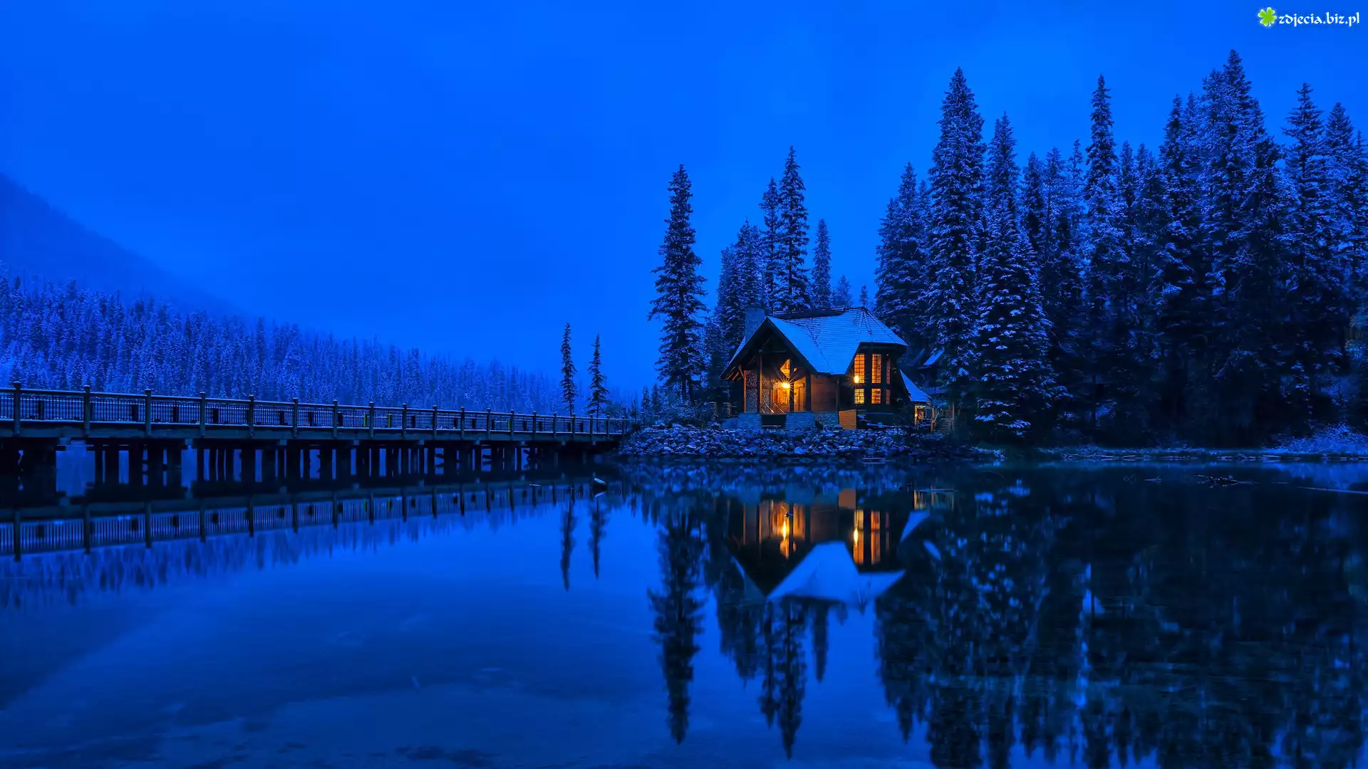 Zdjęcie Park Narodowy Yoho, Jezioro, Emerald Lake, Dom, Oświetlony, Most, Góry, Las, Drzewa, Prowincja Kolumbia Brytyjska, Kanada |
