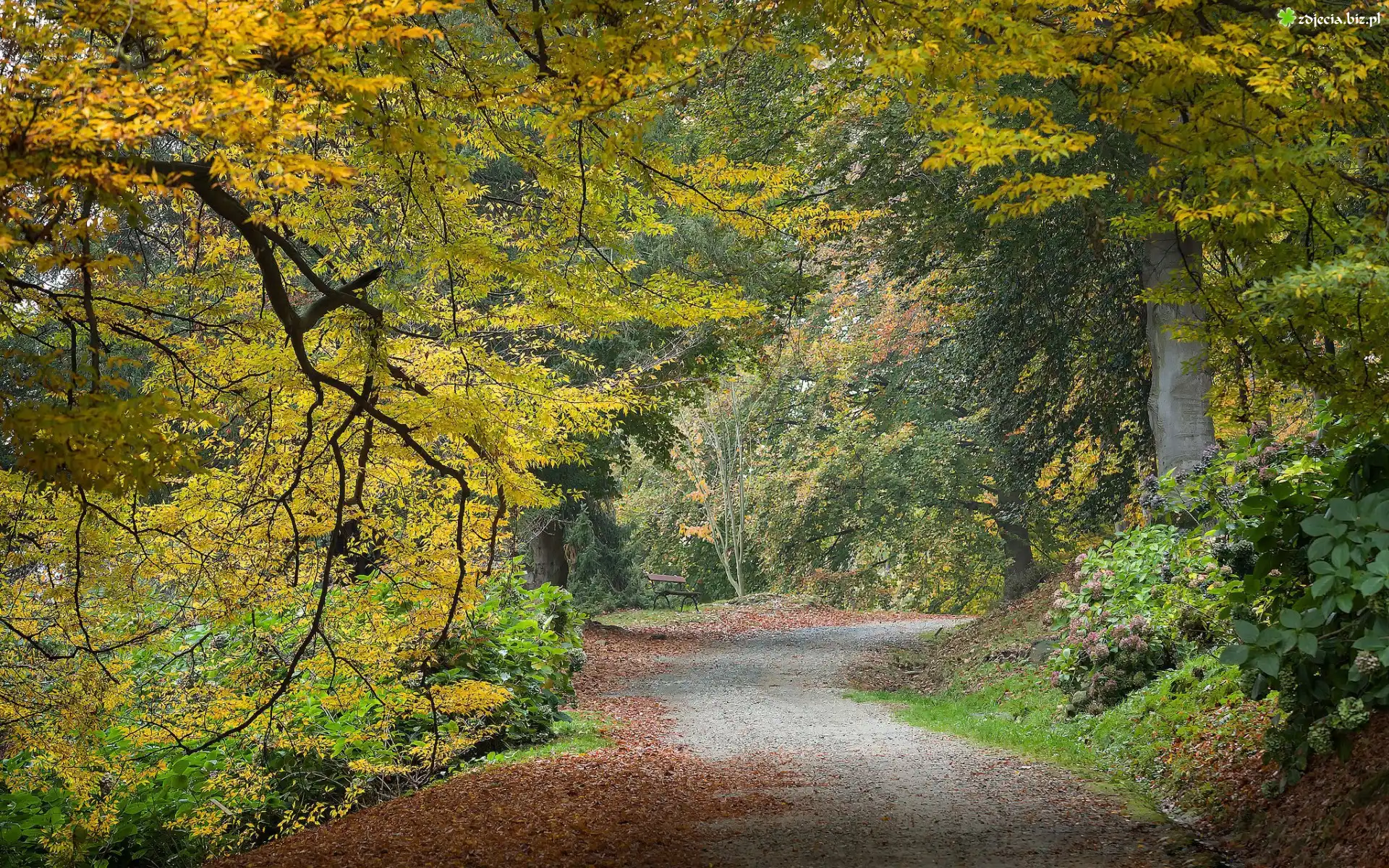 Zdjęcie Park, Drzewa, Żółknące, Liście, Droga, Ławka