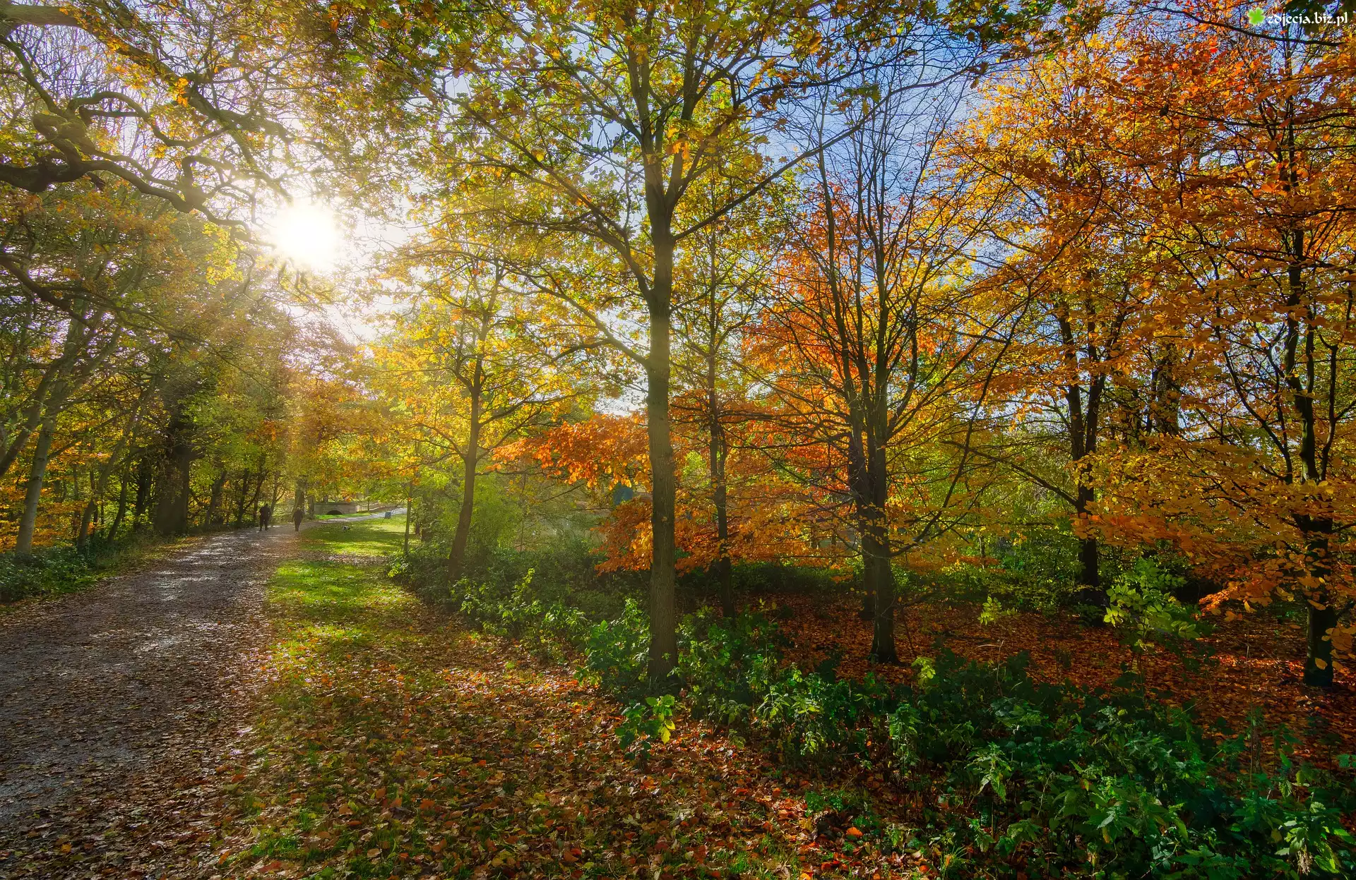 Zdjęcie Park, Jesień, Alejka, Kolorowe, Drzewa, Słońce