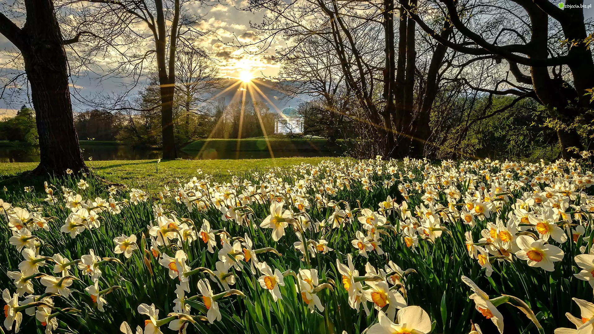 Zdjęcie Park, Narcyzy, Promienie słońca, Drzewa, Altana